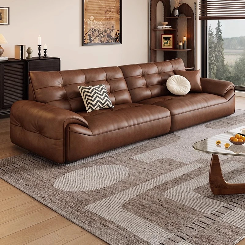レトロな本革ローレンスソファー、調整可能な深い座面で快適さを追求!高級感溢れる新作、ミニマルな小型住宅にもぴったりのリラックススタイル!