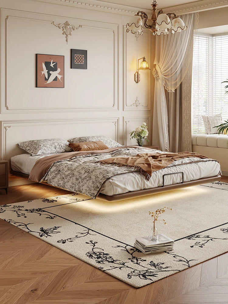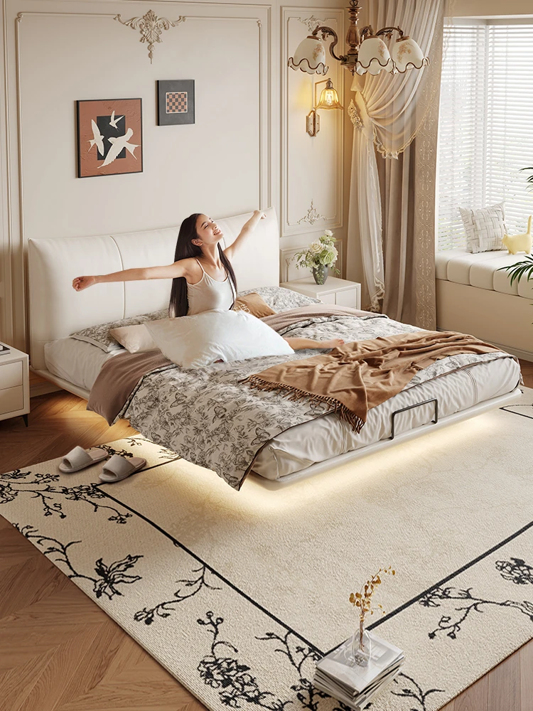 レトロ風雲朵フローティングベッド|主寝室にぴったりな高級感溢れる多機能ミニマルデザイン|上質なレザー仕上げのソフトパッケージダブルベッドで、快適な睡眠空間を実現!