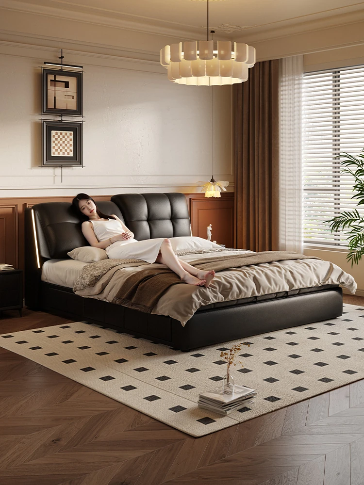 高級感溢れる雲朵本革ベッド - 主寝室にぴったりなダブルベッド!多機能収納付き、レトロなデザインのソフトパックベッドで、あなたの生活空間を華やかに彩ります。