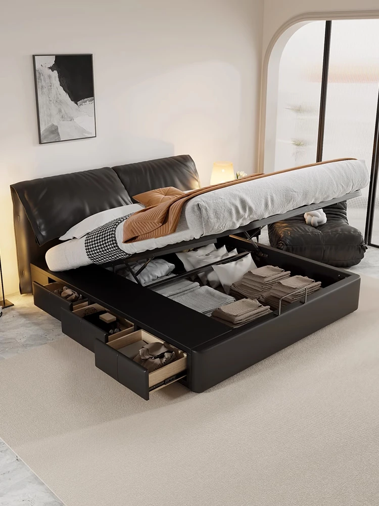 美しいデザインのイタリアンミニマリスト真皮ベッド - ブラックモダンシンプル主寝室用、ラグジュアリー収納ベッド。洗練された収納力で、あなたの生活空間をスタイリッシュに演出します。