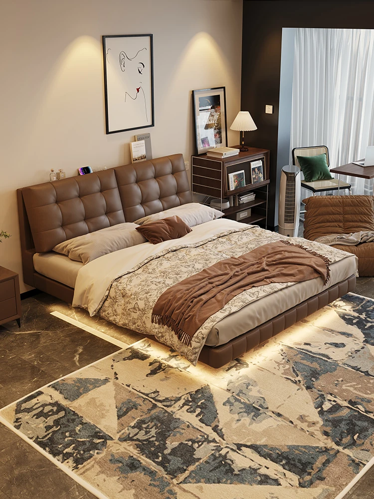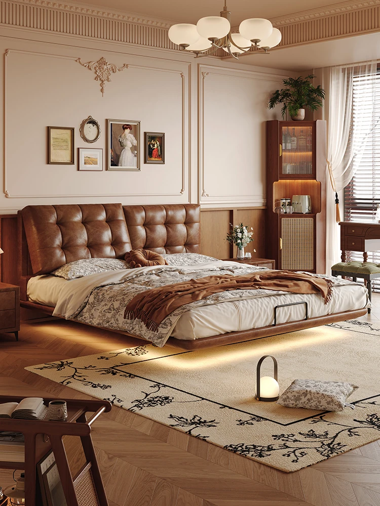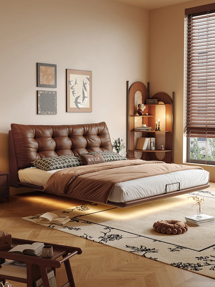 レトロ中古風の本革フローティングベッド、ラグジュアリーなトップグレイン牛革使用の主寝室ダブルベッド、ふわふわソフトパッケージのクラウドフローティングウィンドウベッドで、夢のような寝心地を体験!