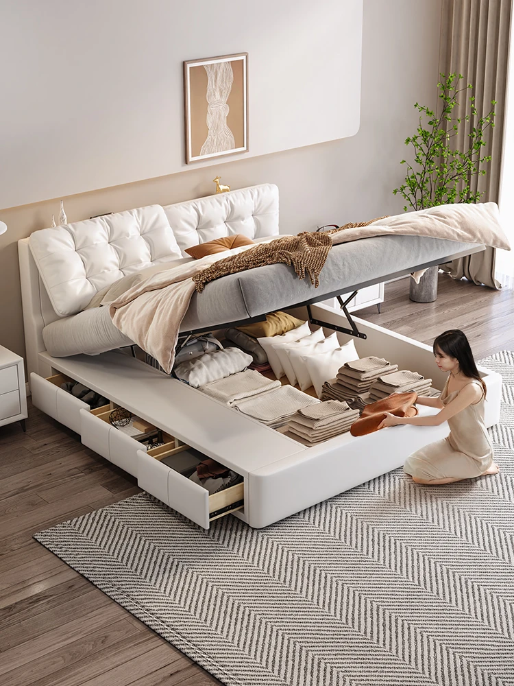 クリーム風雲雲ベッド 2m x 2m 大容量引き出し収納付き モダンシンプルデザイン ダブル主寝室用本革ベッド - スタイリッシュで機能的な空間を演出!