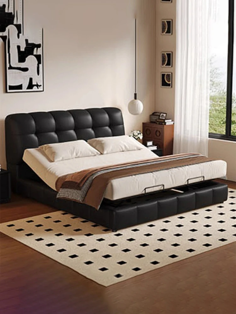 スマート電動ベッド カップル用本革ベッド モダンなシンプルデザイン 主寝室用 ダブル全自動昇降 中古風プフベッドで快適な眠りを実現!