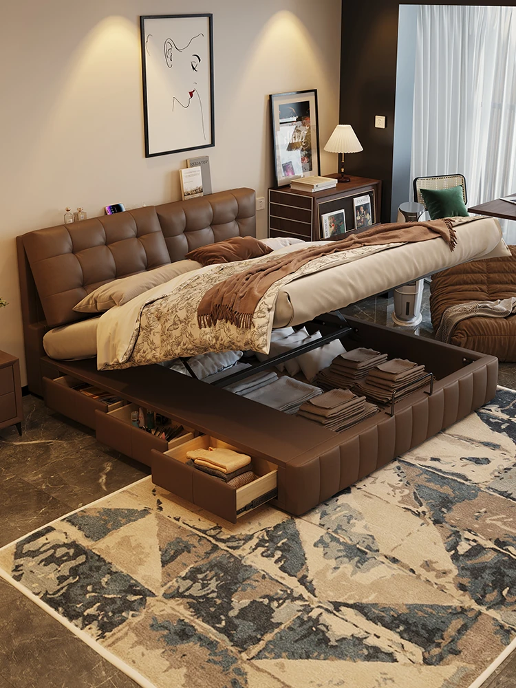 【即日発送】レトロな雰囲気のストレージベッド!雲のような本革引き出し付きダブルベッド、イタリアンミニマルデザインの主寝室に最適です。快適さとスタイルを両立した一品!