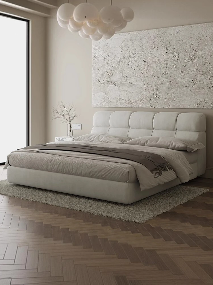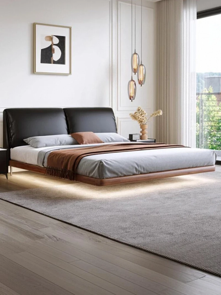 イタリアンミニマリスト豆腐ブロック浮遊ベッド 高級感溢れる 2m x 2m 主寝室用 ダブルベッド 端整えたデザイン 本革仕上げ