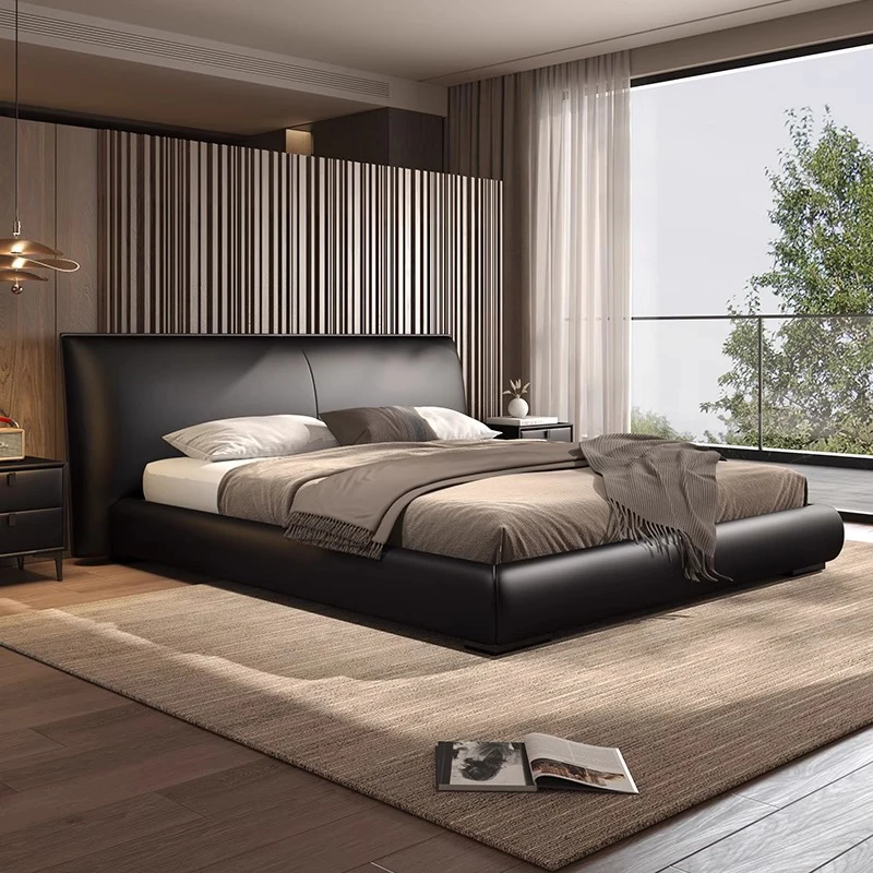贅沢なイタリアンデザインの本革製スリーピングベッド、シンプルで洗練された無垢材の高級感あふれる黒色ソフトパッケージ、主寝室にぴったりの上品な一品。