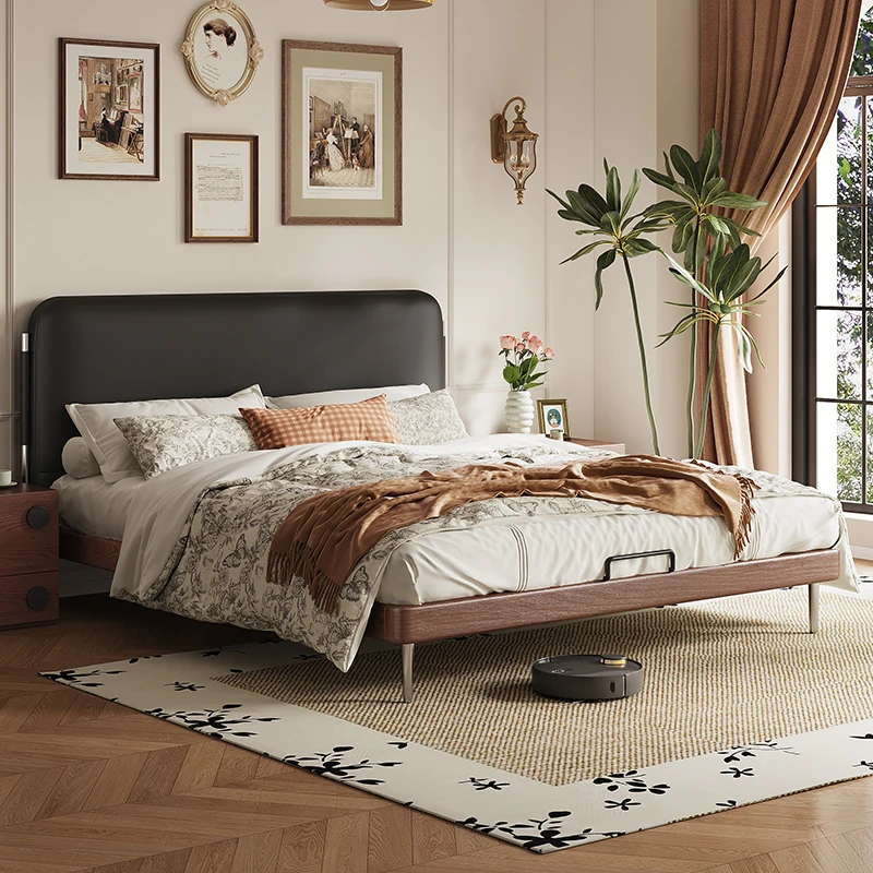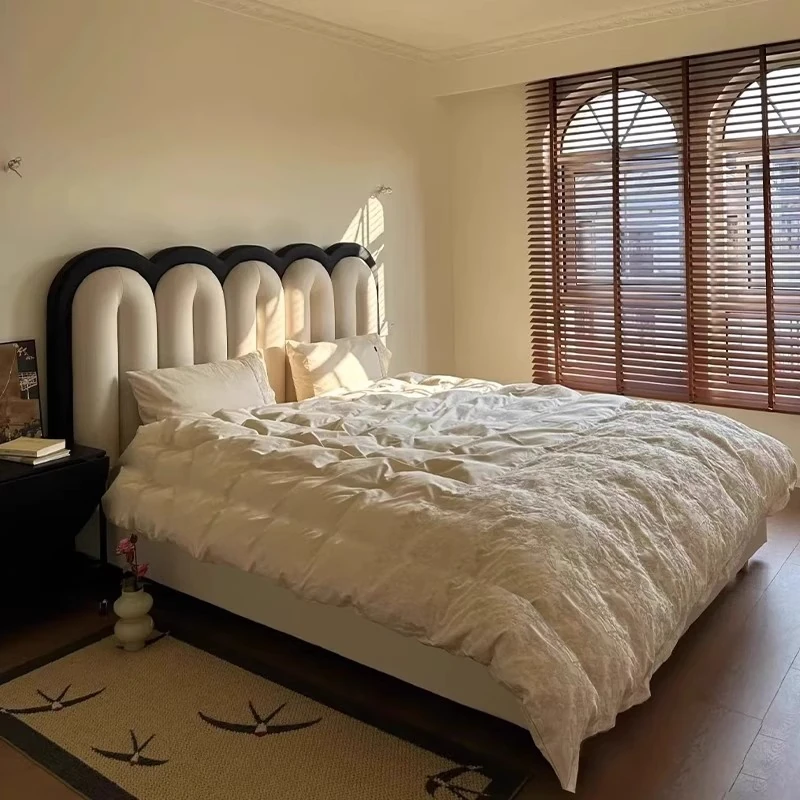 フレンチヴィンテージ本革ベッド|イタリアンミニマルデザイン|小さな部屋にぴったりのモダンシンプル薄型ヘッドボードダブルベッド|主寝室に最適なスタイリッシュな大床!