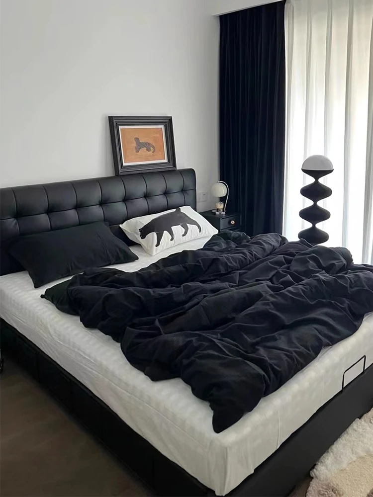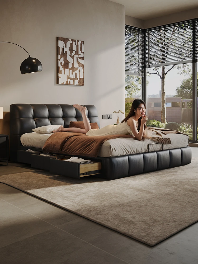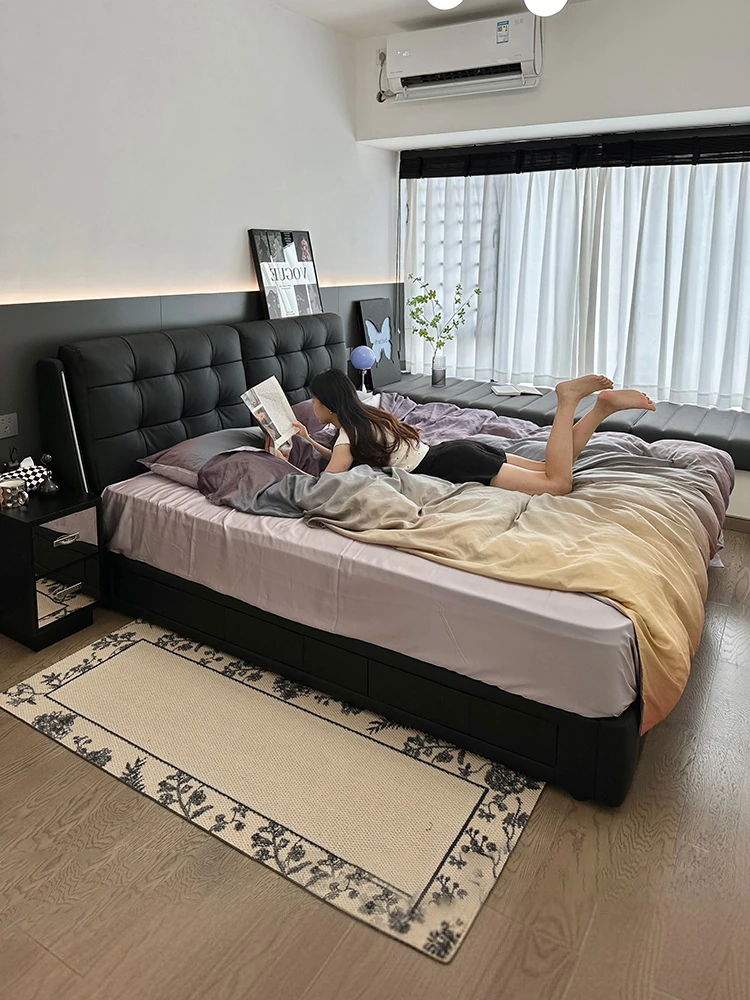 Modern Minimalist Black Vintage Double Bed with Storage - Italian Style Genuine Leather Cloud Bed for Main Bedroom