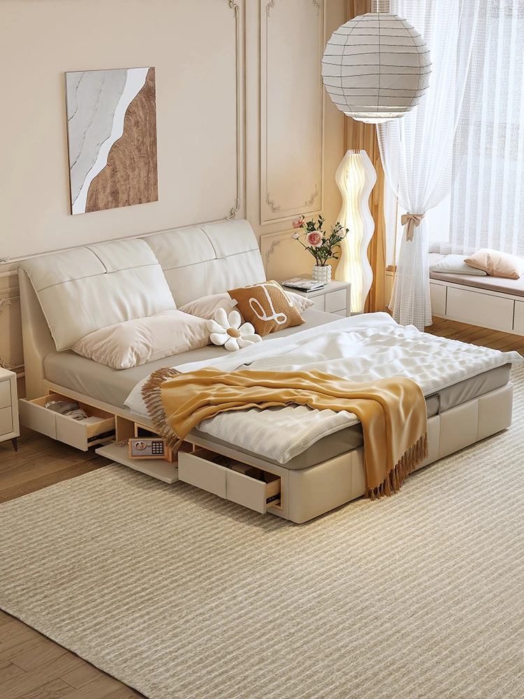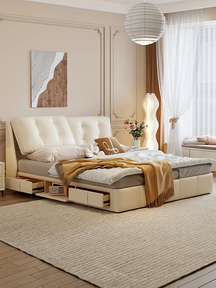 Luxurious Cream Leather Bed - Modern Multifunctional Double Bed with Solid Wood High-Storage Drawers and Soft Upholstered Headboard - Perfect for Master Bedrooms