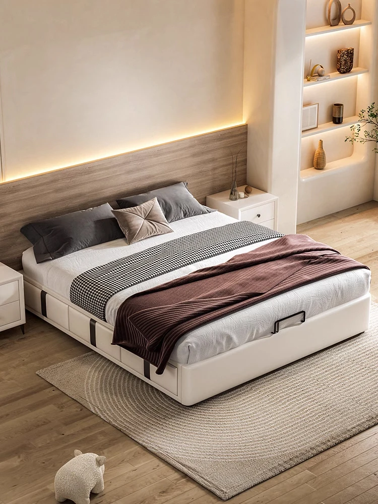 Luxury Genuine Leather Bed with Storage - Modern Minimalist Design, Cream Style Upholstered Bed for Master Bedroom, Space-Saving High-Storage Feature