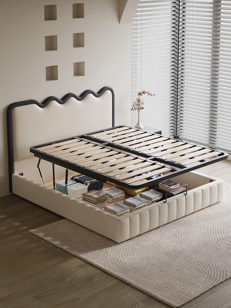 2025 New Wave Design Cream Leather Bed with Storage - Space-Saving Piano Key Style for Modern Homes, Featuring Trendy Ins Design
