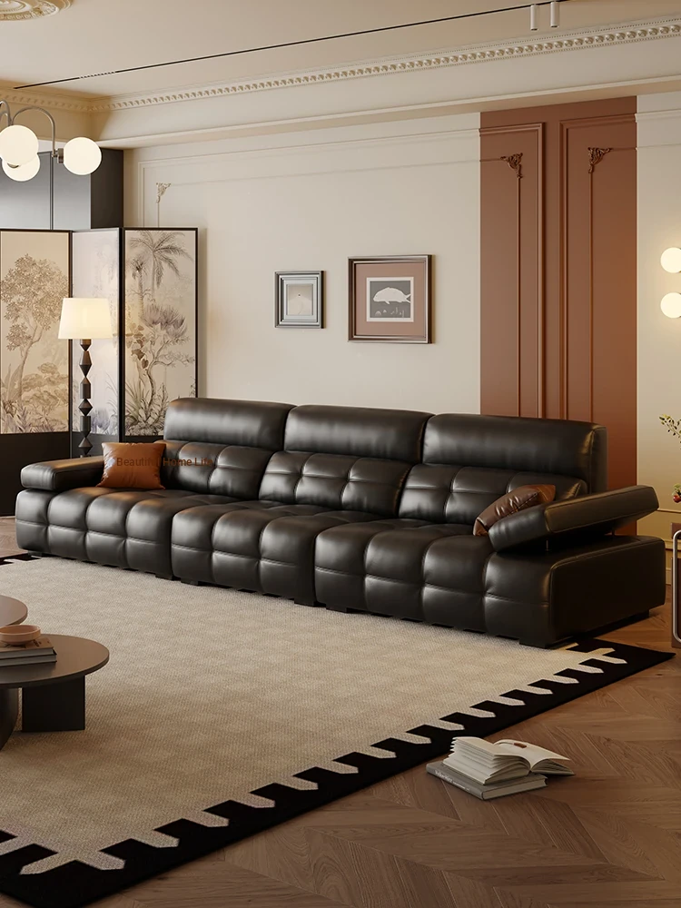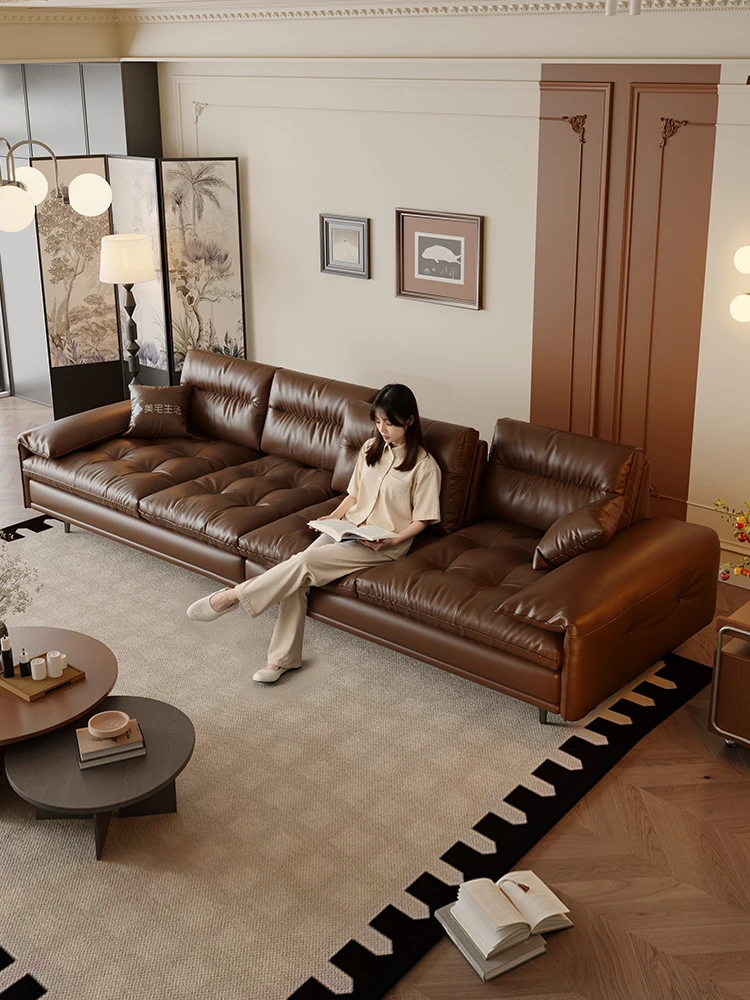 French Vintage Genuine Leather Sofa - 2025 New Retro Style Mid-Century High Leg Black Sugar Cloud Sofa for Living Room