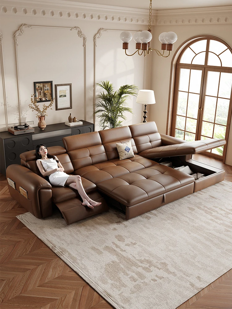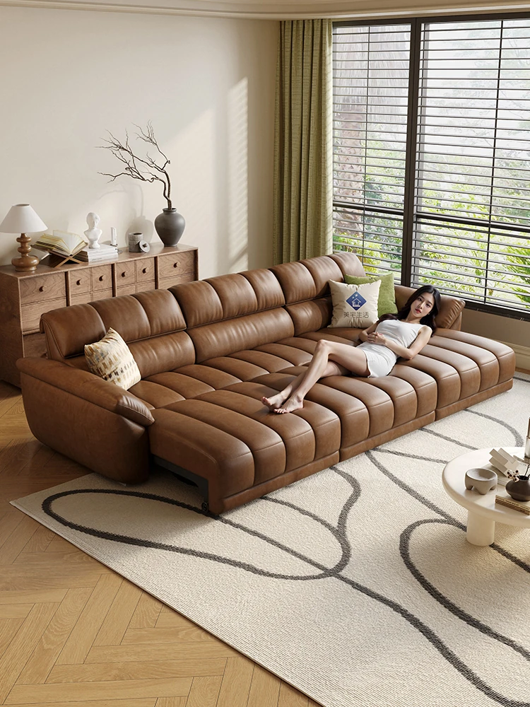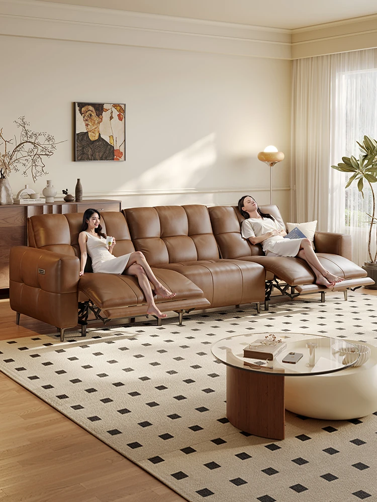 French Vintage Style Electric Sofa with Cloud Listening Design - Premium Top-Grain Leather, Wall-Hugging True Leather Functional Sofa for Elegant Living Spaces