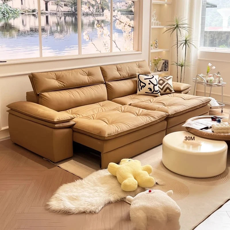 Creamy Space Cloud Electric Functional Genuine Leather Sofa Bed - Versatile and Expandable Sailboat Sofa for Living Room, No Wall Required