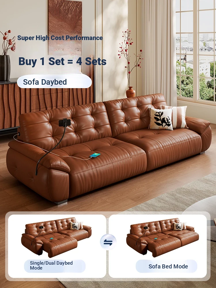 Vintage Genuine Leather Smart Voice-Controlled Cloud Sofa Bed - Multifunctional Retro Style for Living Room - New 2023 Model, Perfect for Cozy Spaces!