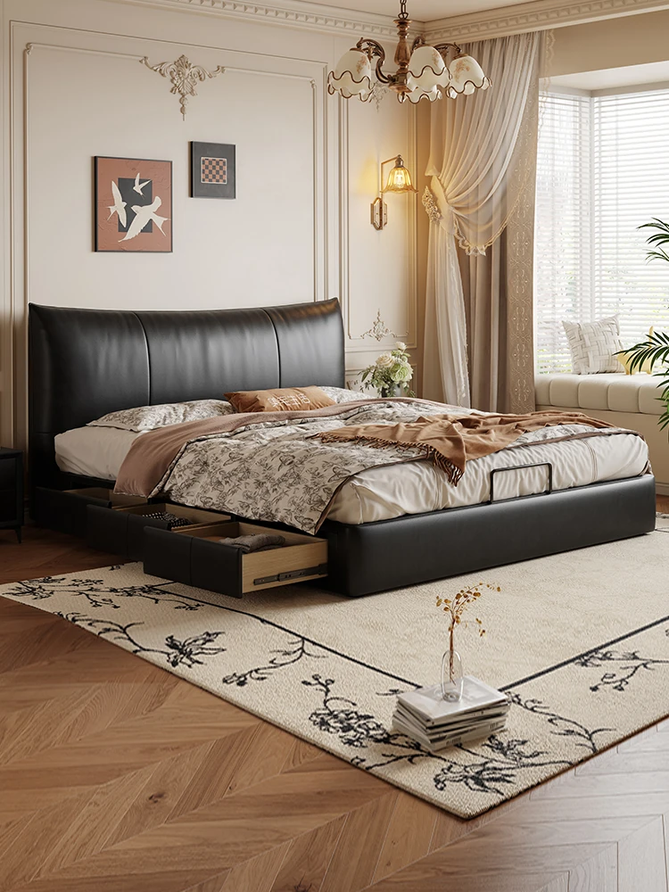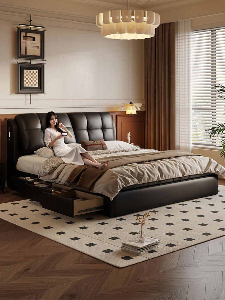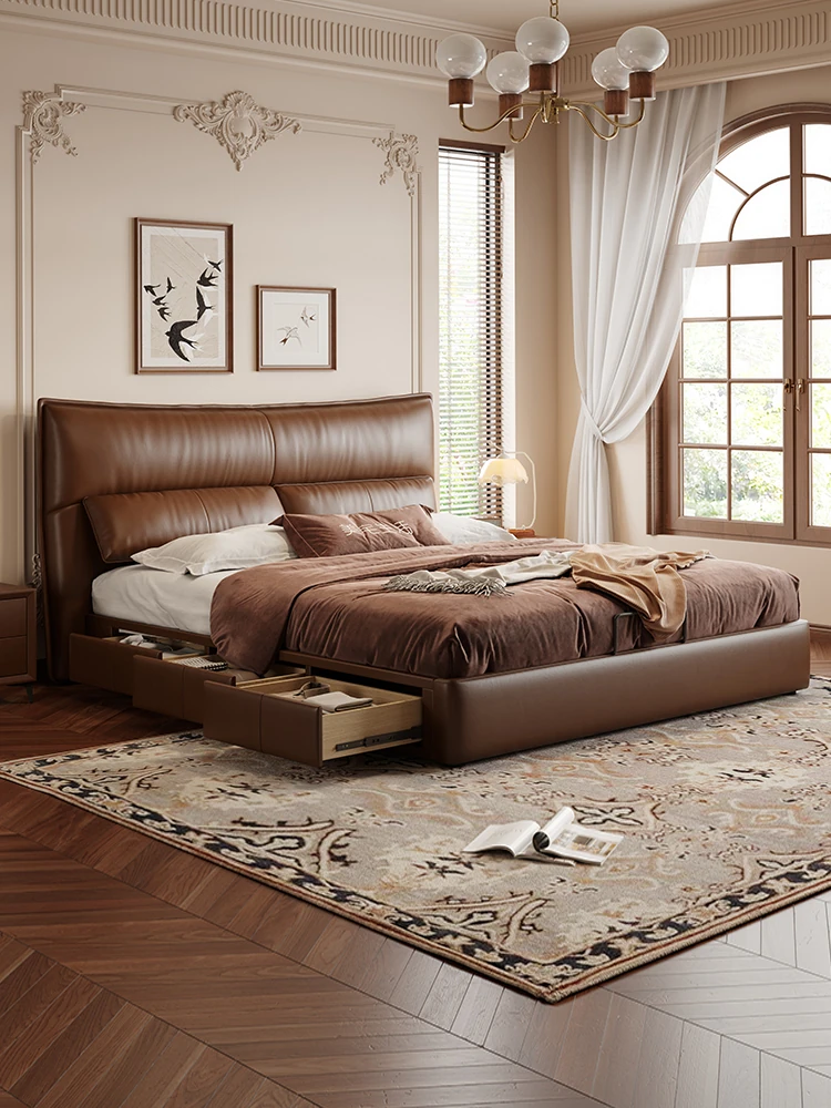 Cloud Storage Bed - Vintage Luxurious Minimalist Leather Bed for Master Bedroom, High-End Genuine Leather Upholstered Multifunctional Double Bed, Perfect for Stylish Living