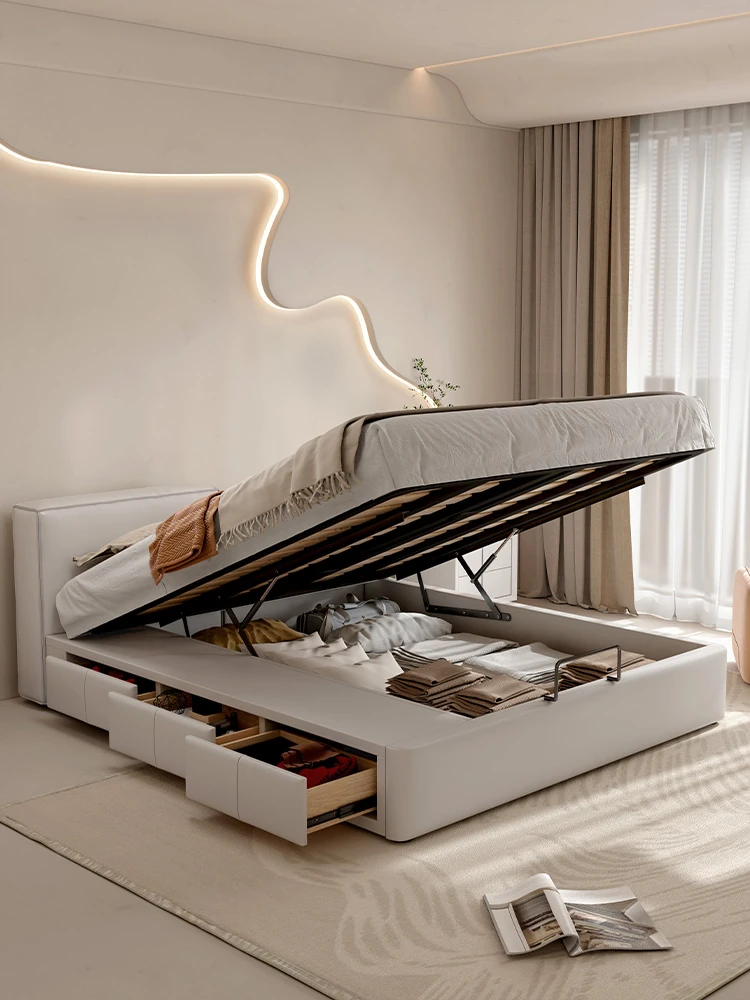 Modern Minimalist Genuine Leather Bed with Storage High Box and Soft Upholstery - Perfect for Master Bedrooms and Newlyweds, Spacious Double Bed with Edge Design