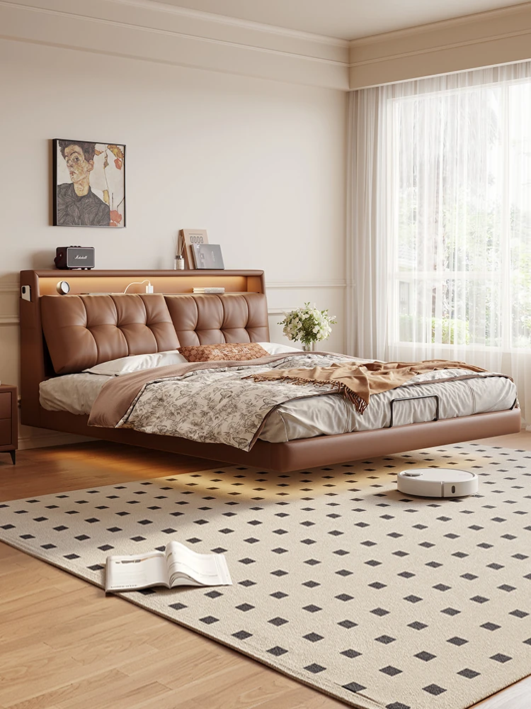 Multi-Functional Cloud Floating Bed - Vintage Luxury Minimalist Leather Bed for Master Bedroom, High-End Elegant Genuine Leather Upholstered Double Bed