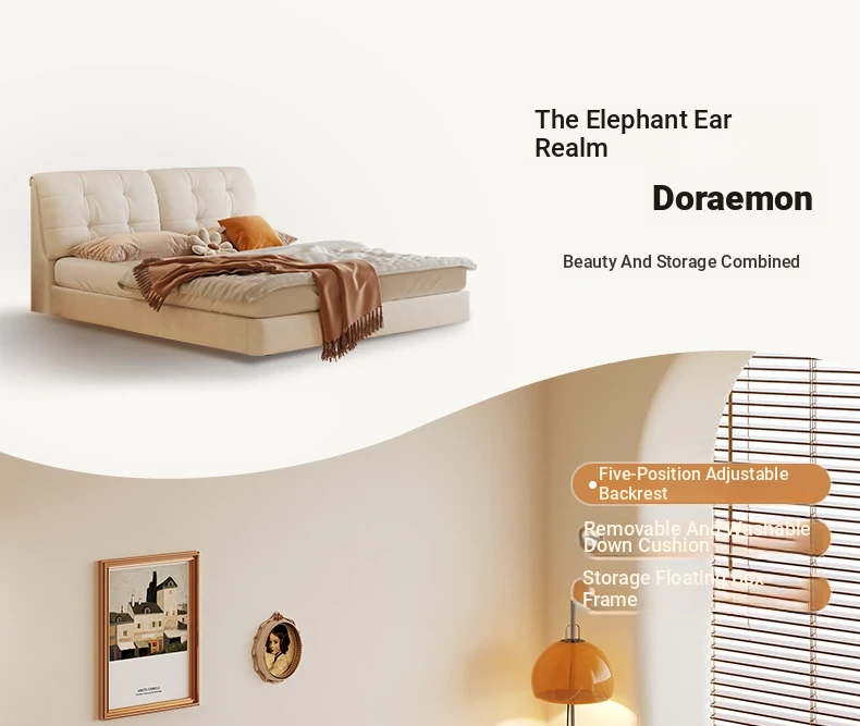 Cream-Themed Master Bedroom Floating Storage Bed with Tech Cat Claw Fabric - French Elephant Ear Design, Undisturbed Sleep Elevated Bed