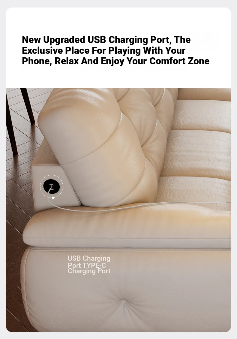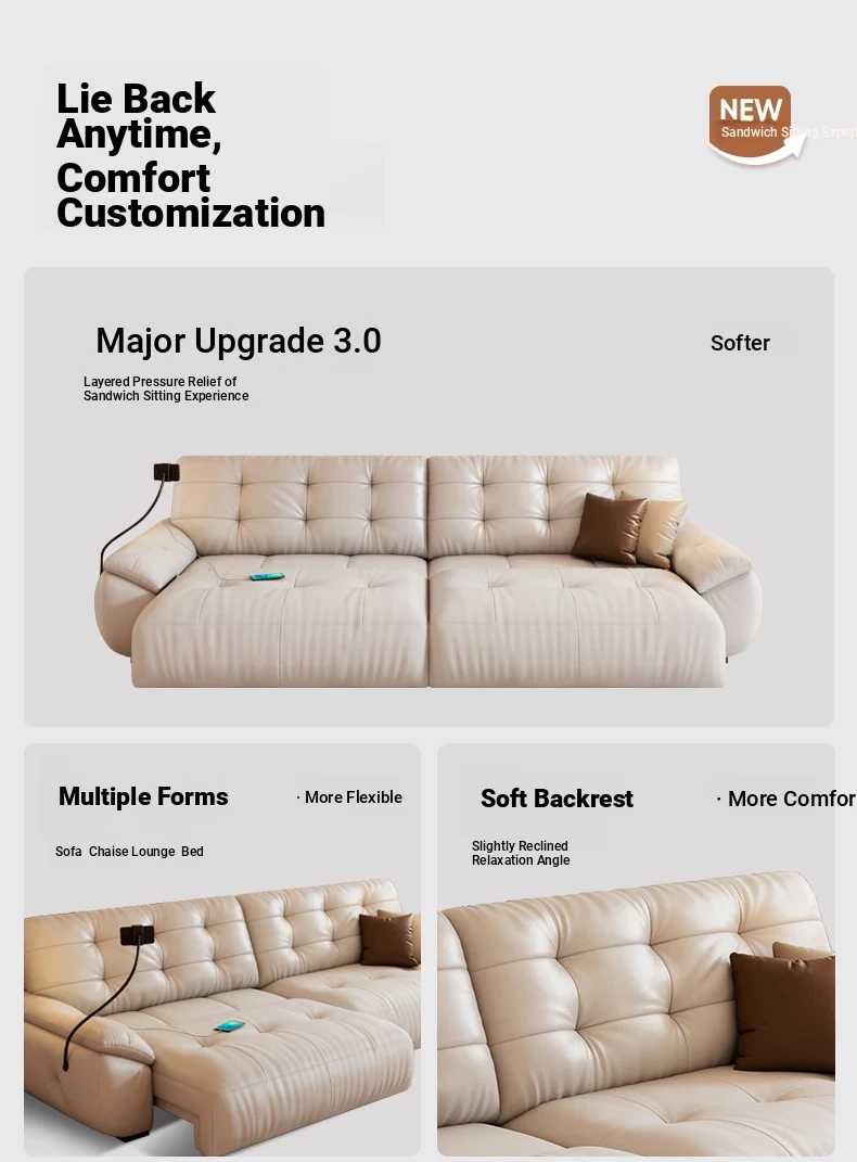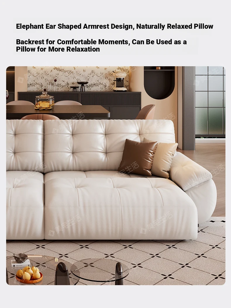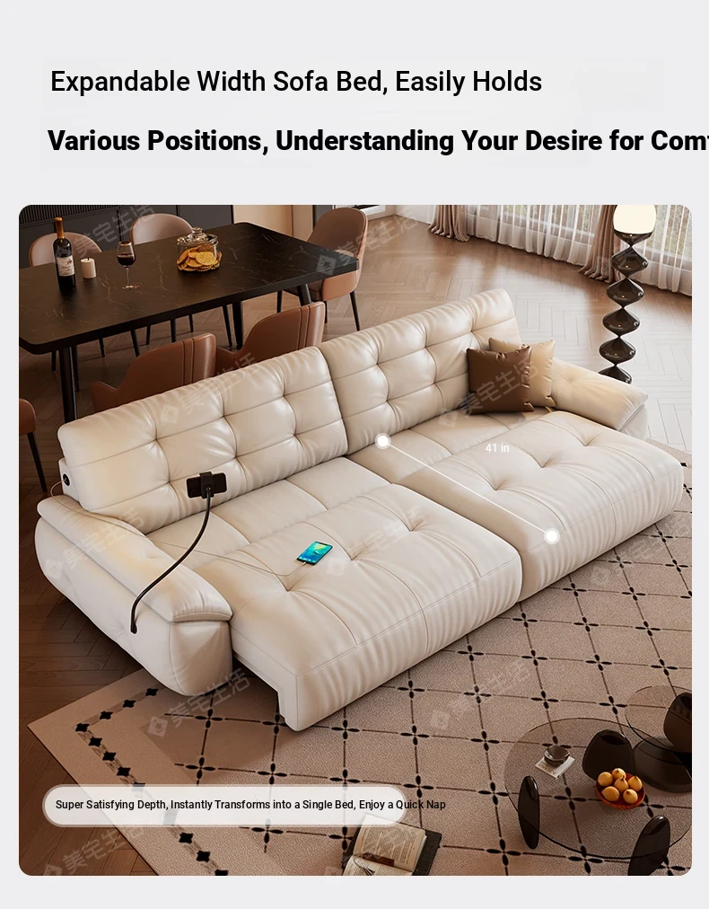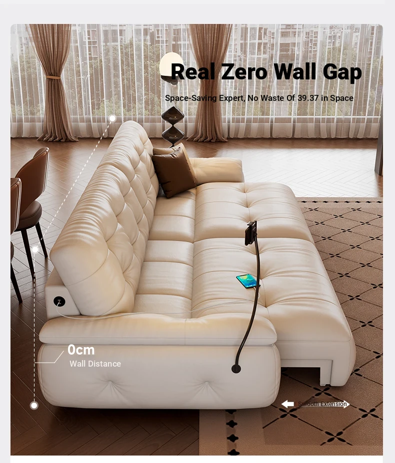 Creamy Space Cloud Electric Functional Genuine Leather Sofa Bed - Versatile and Expandable Sailboat Sofa for Living Room, No Wall Required