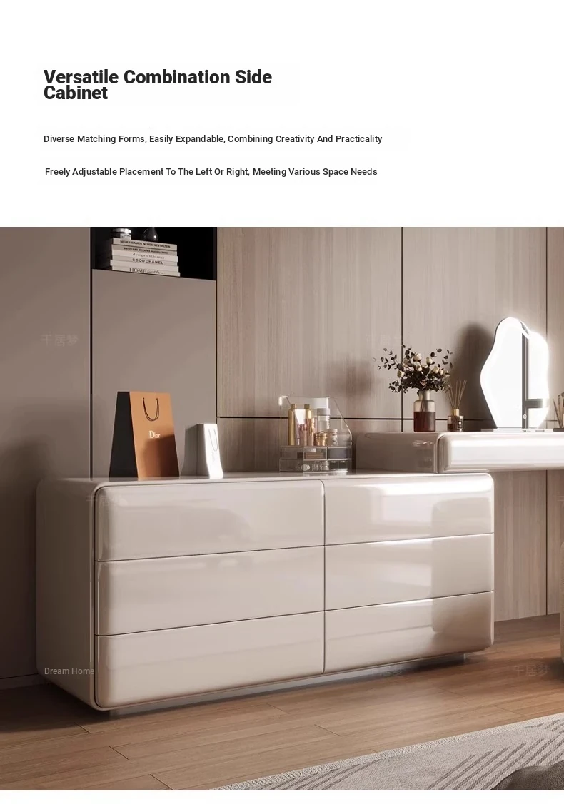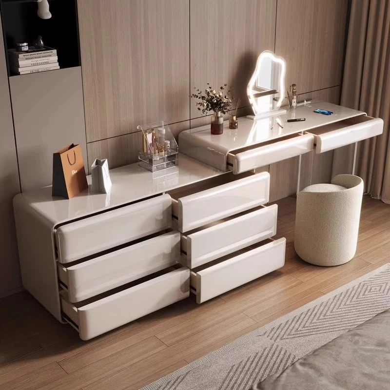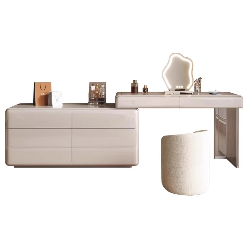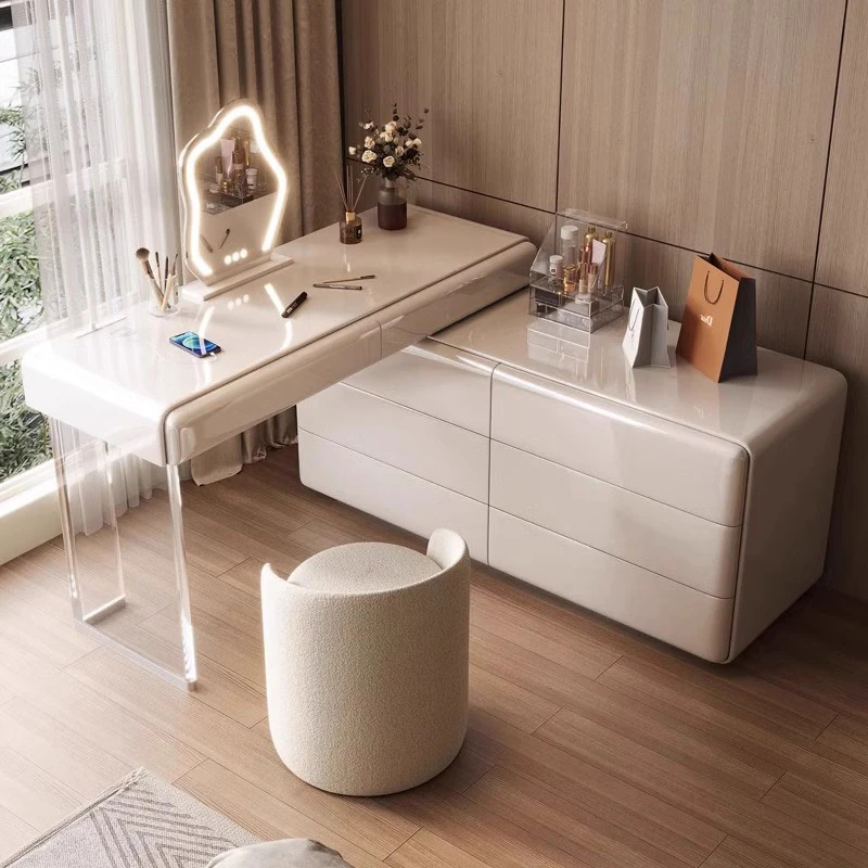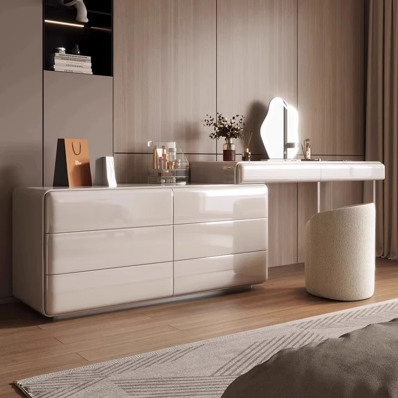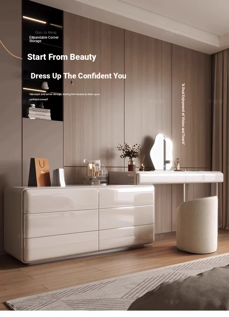 Creamy Style Vanity Dresser with Integrated Solid Wood & Acrylic Design - Minimalist Bedroom Corner Cabinet with Expandable Makeup Table for Stylish Storage Solutions