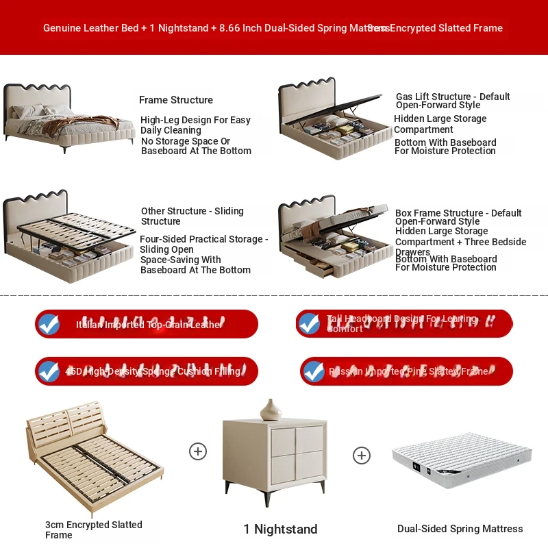First layer cowhide bed +1 cabinet +8.66in soft and hard spring mattress