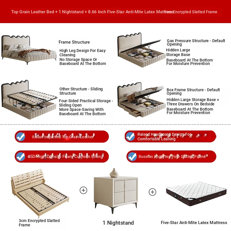 Top layer cowhide bed +2 cabinets +8.66in five-star mite removal latex mattress