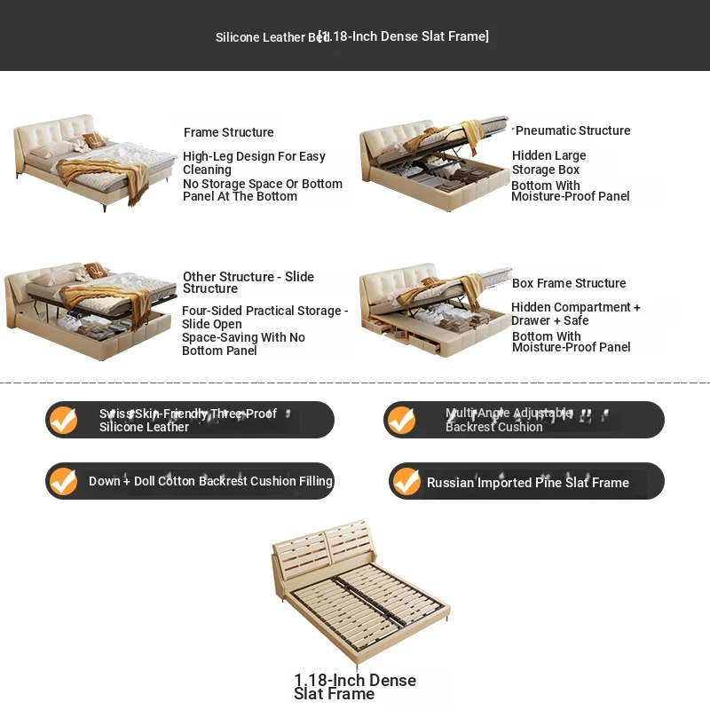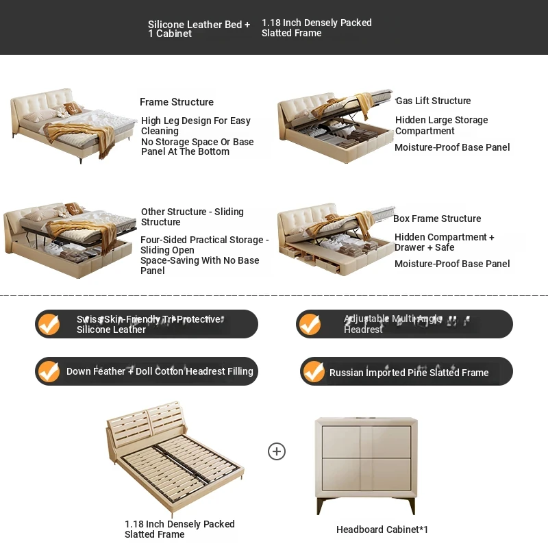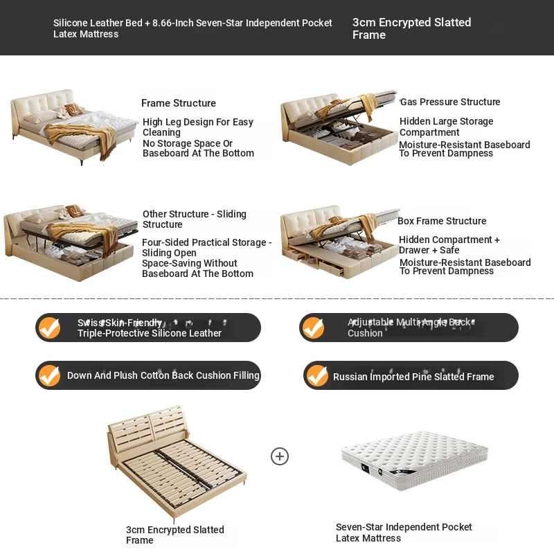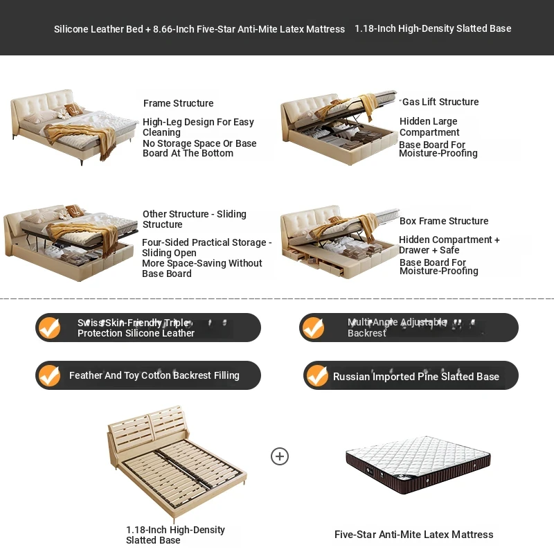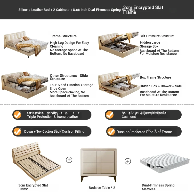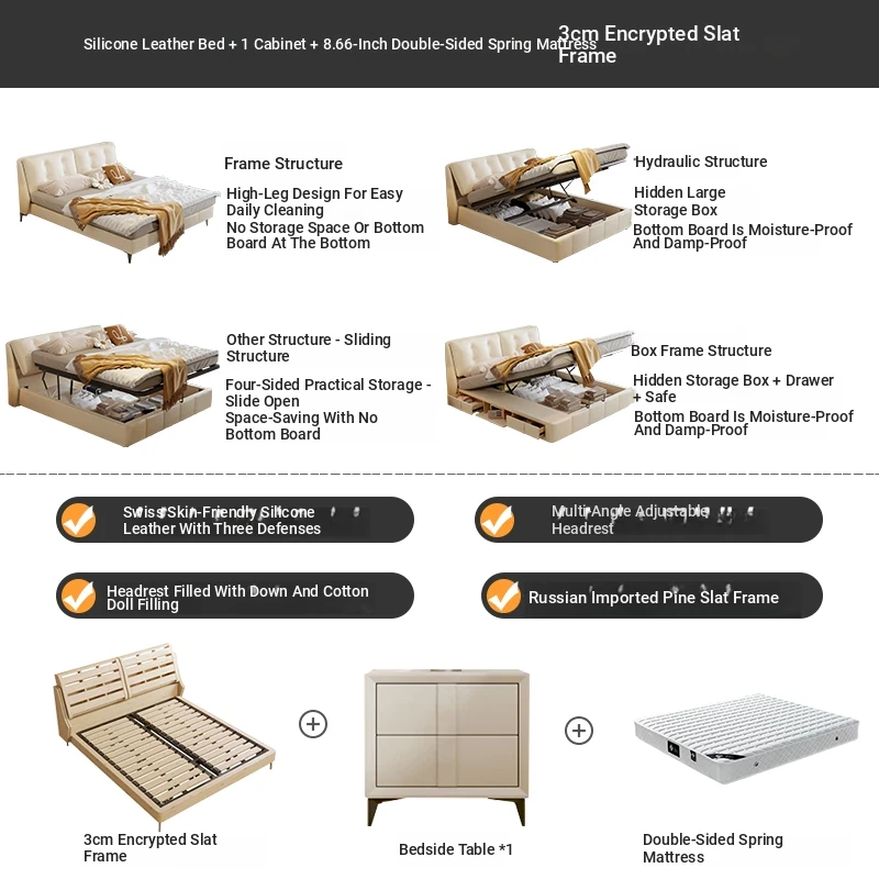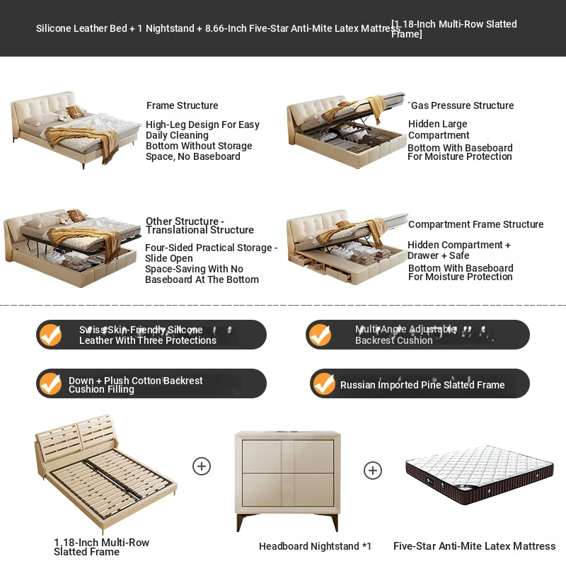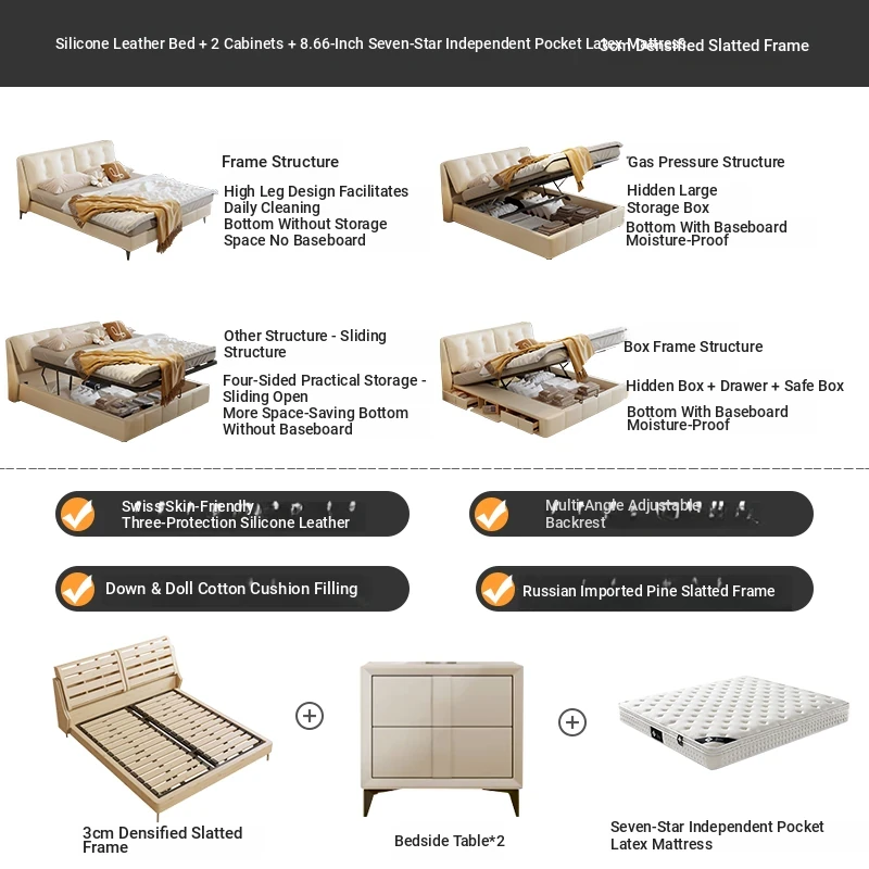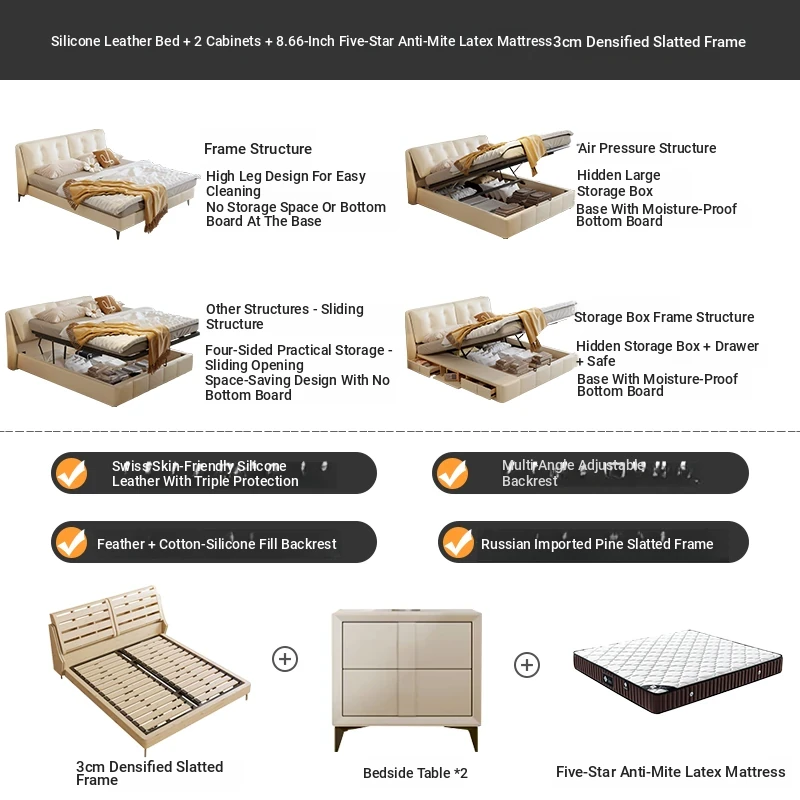 Silicone leather bed +2 cabinets +8.66in five-star mite removal Latex Mattress [1.18in encrypted row skeleton]]