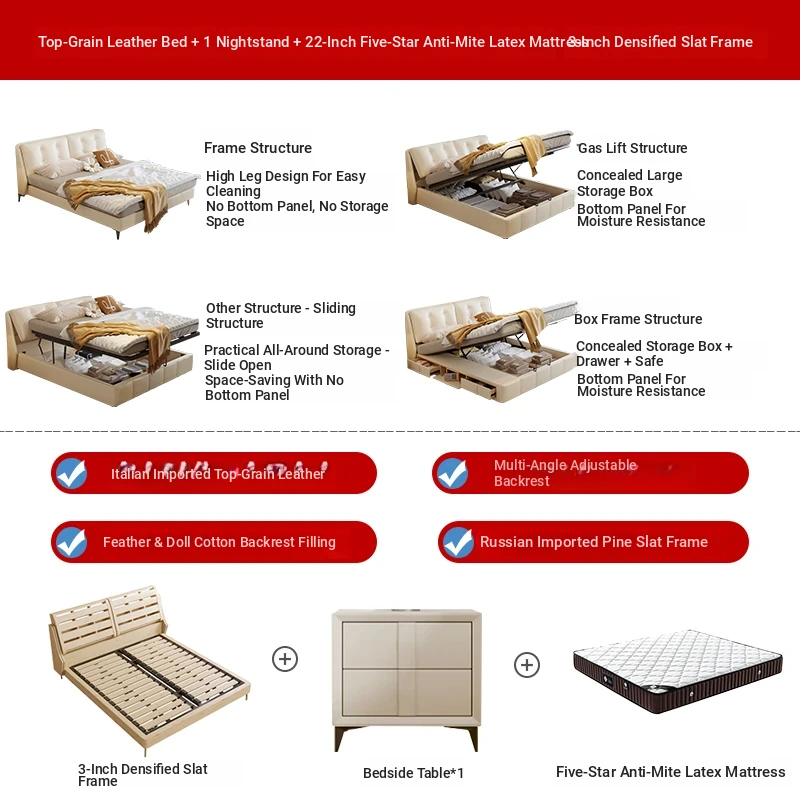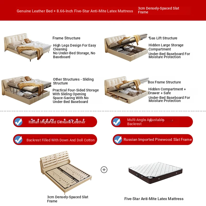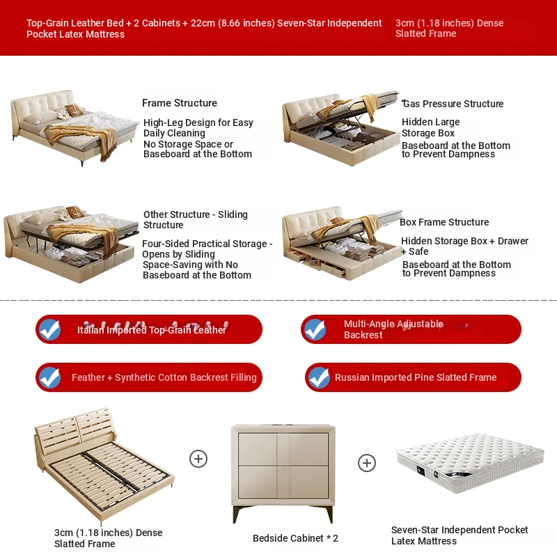 Top layer cowhide bed +2 cabinets +8.66in five-star mite removal latex mattress