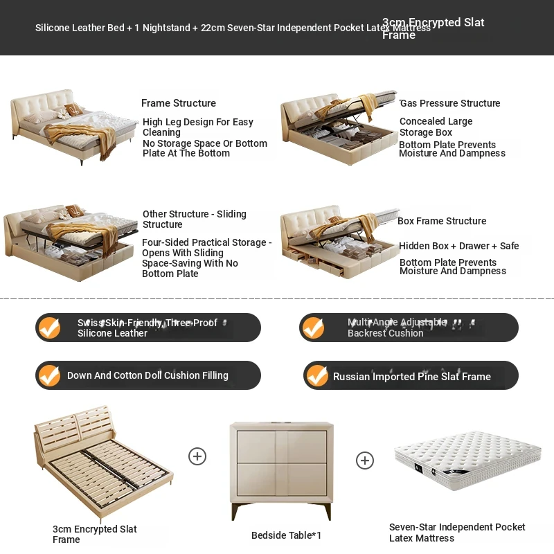 Silicone leather bed +1 cabinet +8.66in seven-star Independent bag Latex Mattress [1.18in encrypted row skeleton]]