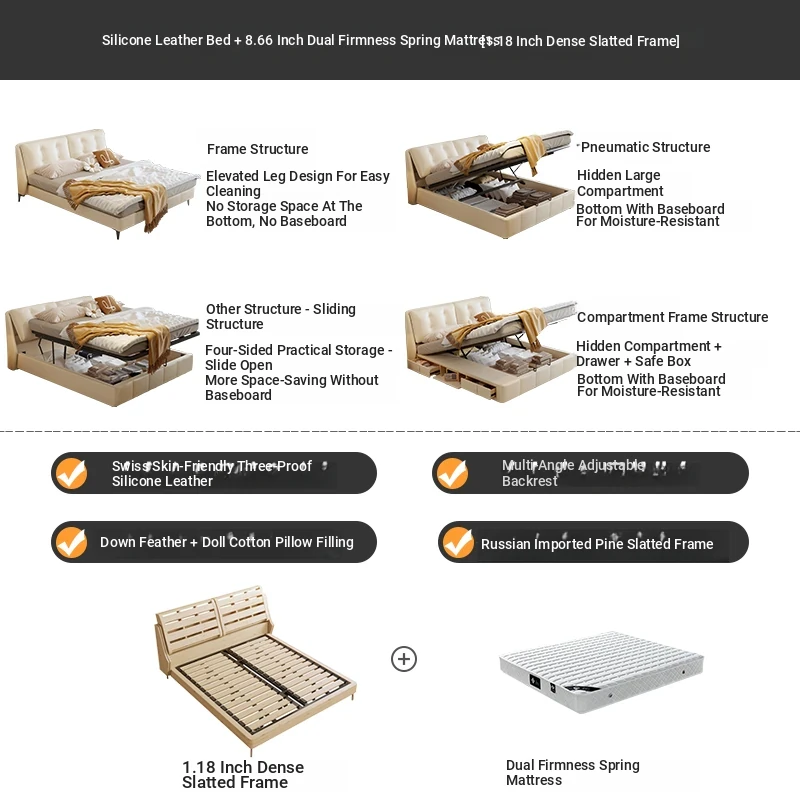 Silicone leather bed +1 cabinet +8.66in soft and hard dual-purpose spring mattress [1.18in encrypted row skeleton]]