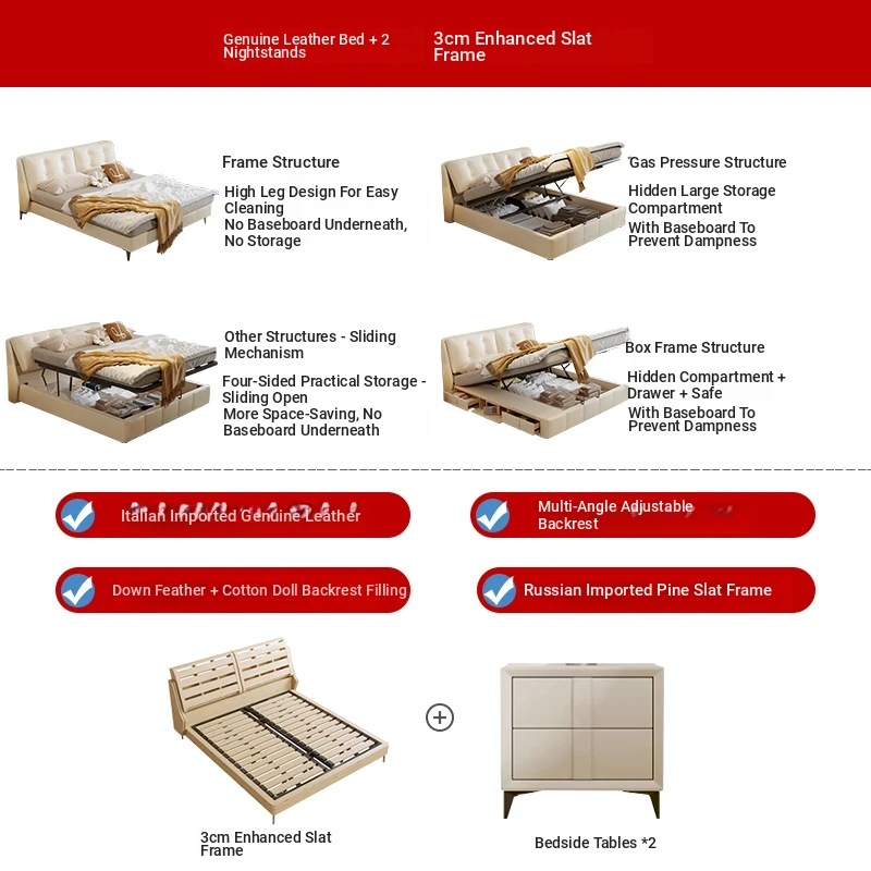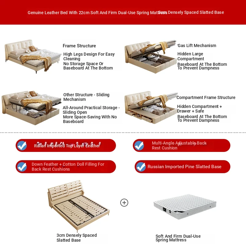 First layer cowhide bed +2 cabinets +8.66in soft and hard dual-purpose spring mattress