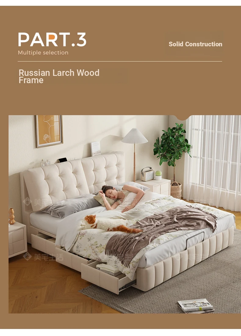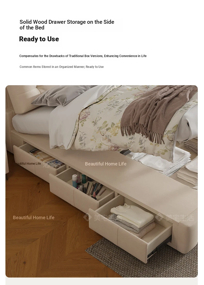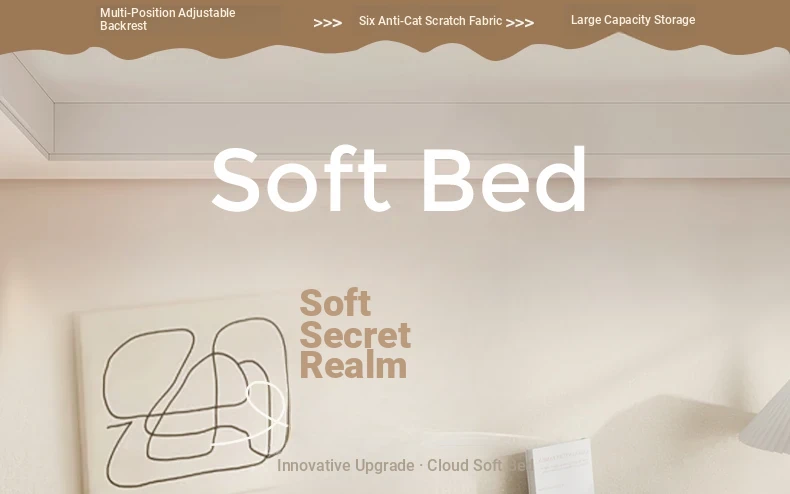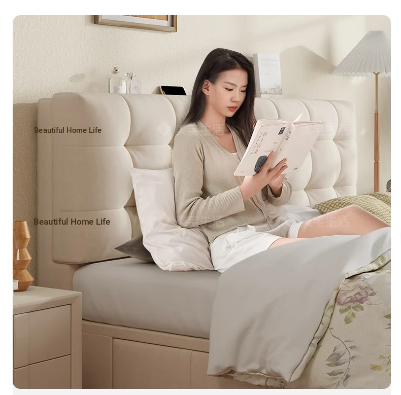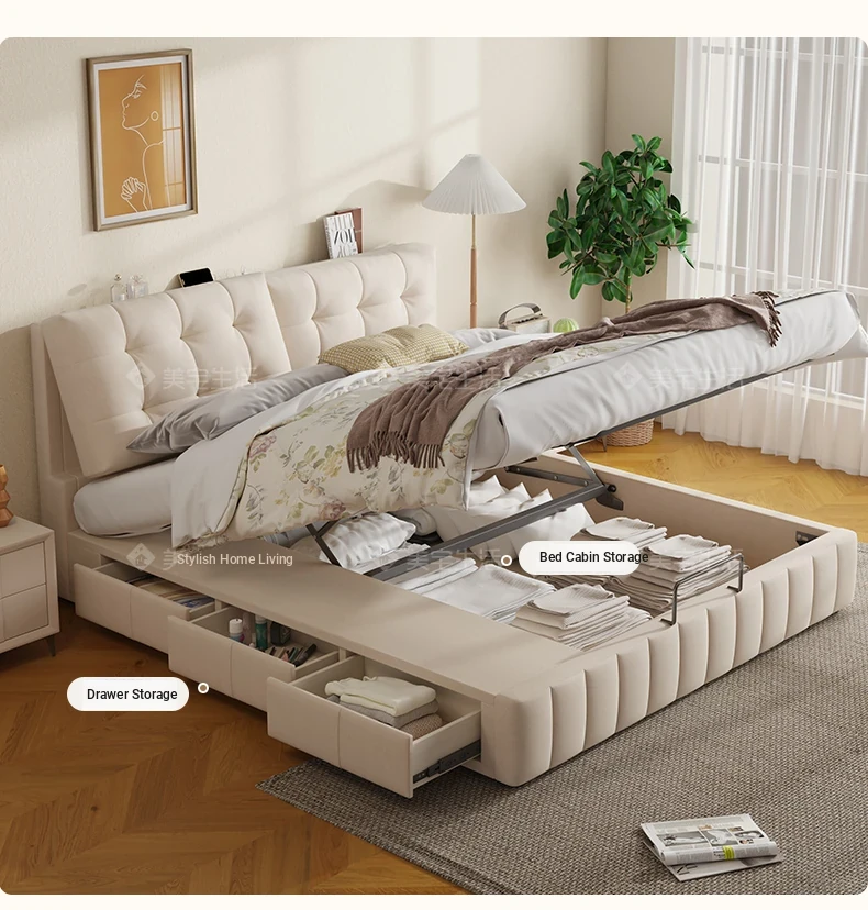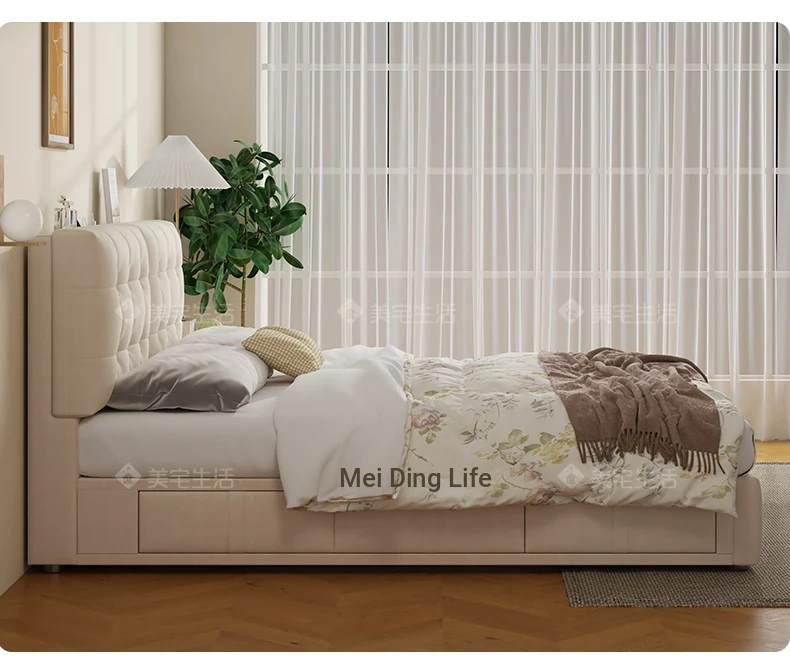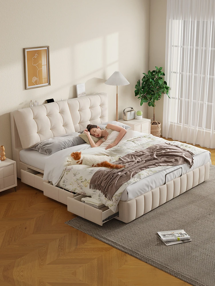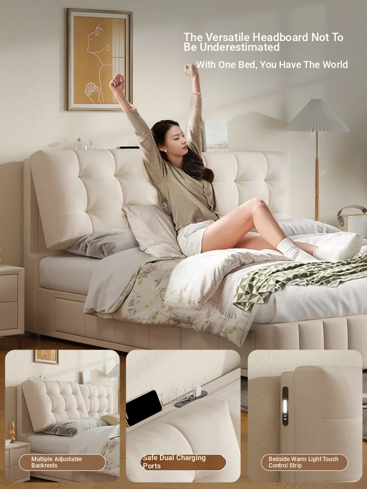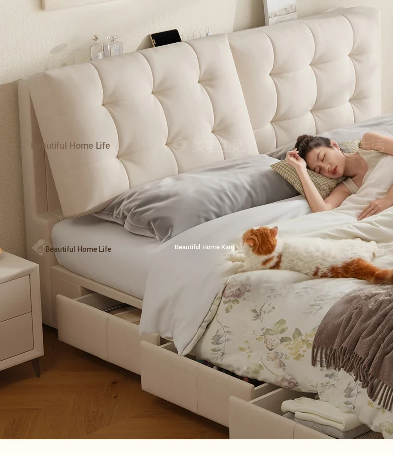 Modern Minimalist Cream Cloud Bed with Cat Scratch Fabric and Storage Drawers – Perfect for Couples in Master Bedrooms – Stylish New Wedding Bed for Your Dream Home!