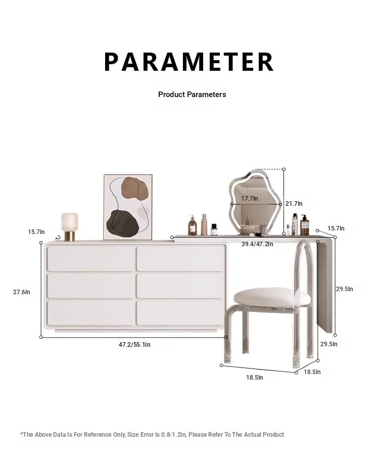 47.24 in dressing table +55.12 in six-drawer cabinet + mirror (matte milk white) + makeup stool