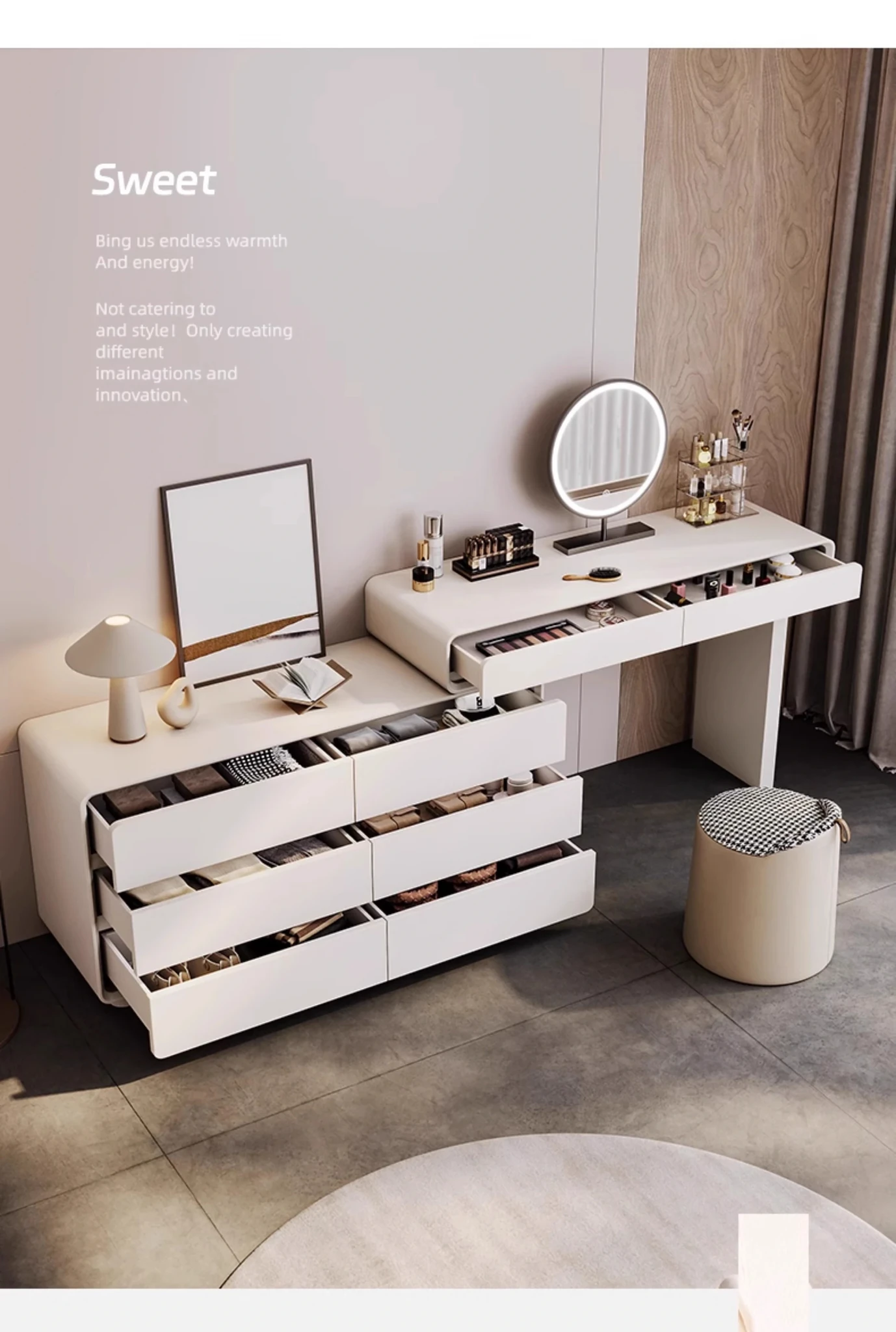 Cream White 47.24 in Makeup Table +47.24 in Six Bucket Cabinet + Intelligent Mirror