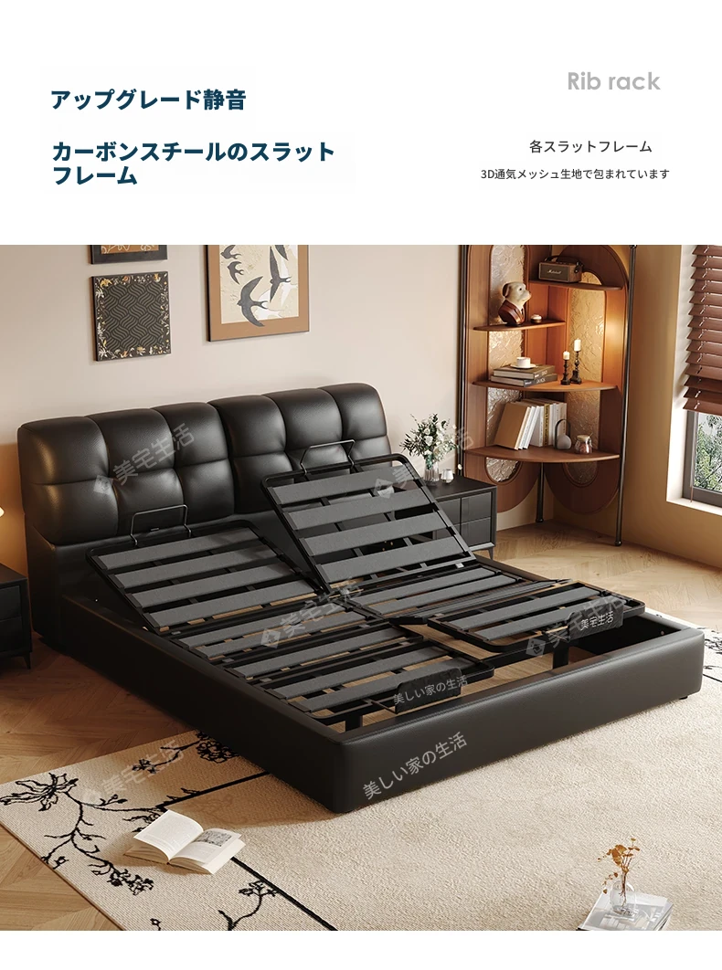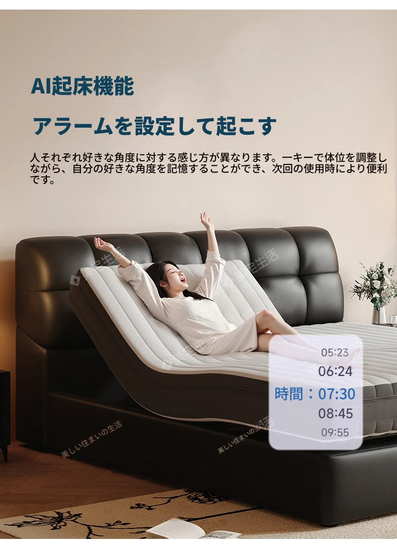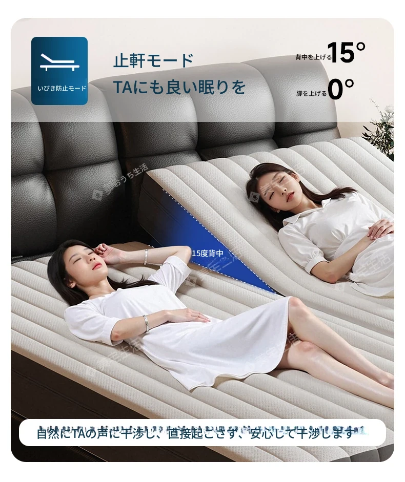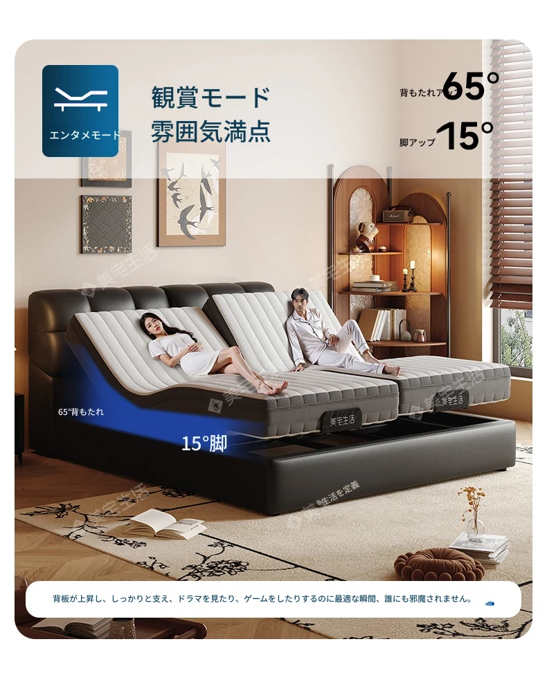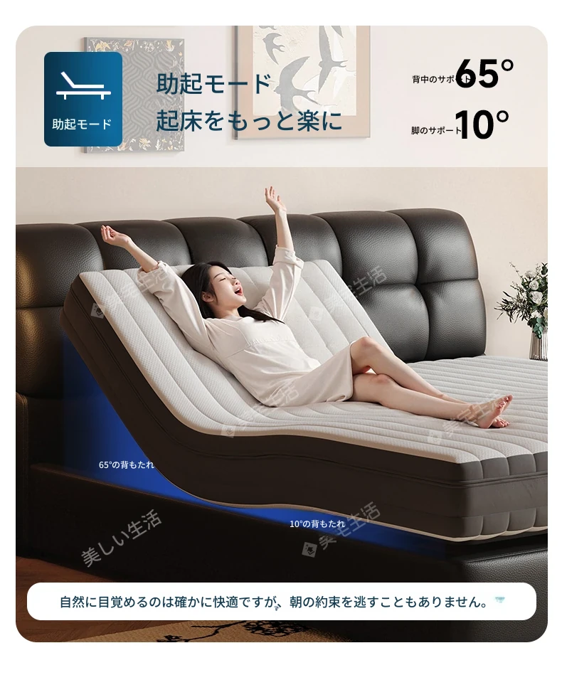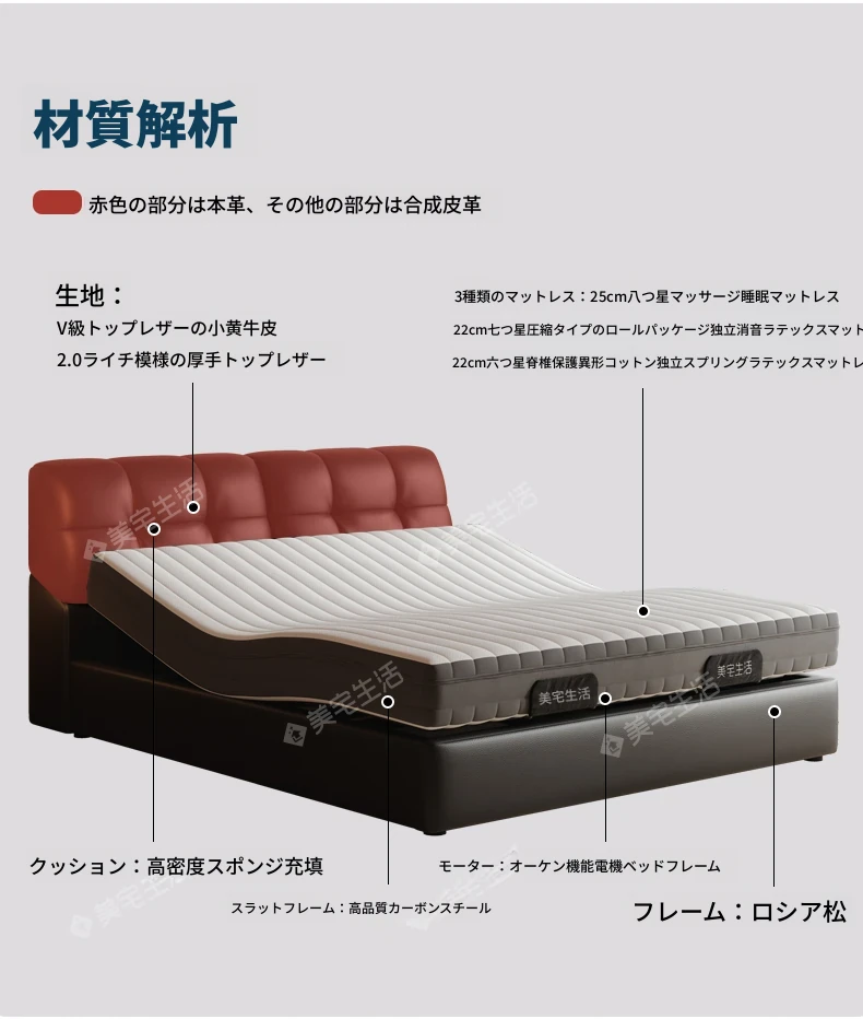 V+級輸入2.0加厚トップレザー光沢牛皮【ドイツOKINスリーモーター】ハーフ分体ベッドフレーム+八つ星マッサージ助眠マットレス