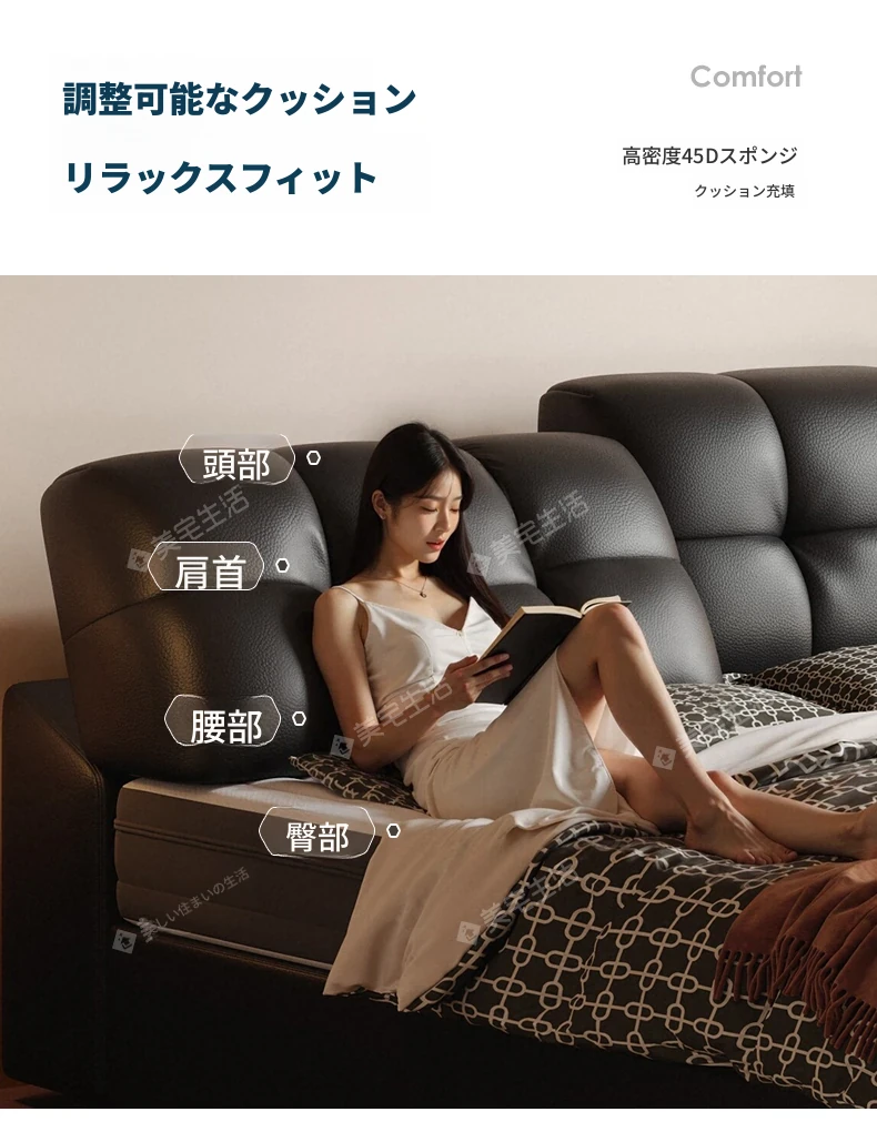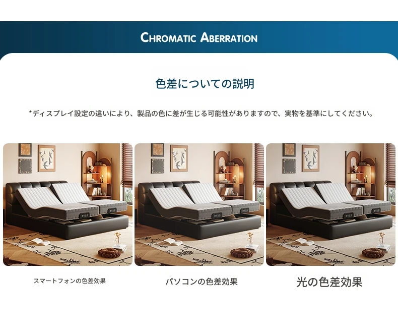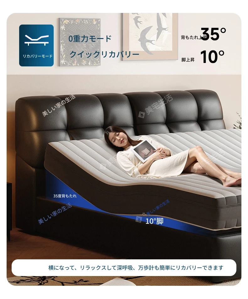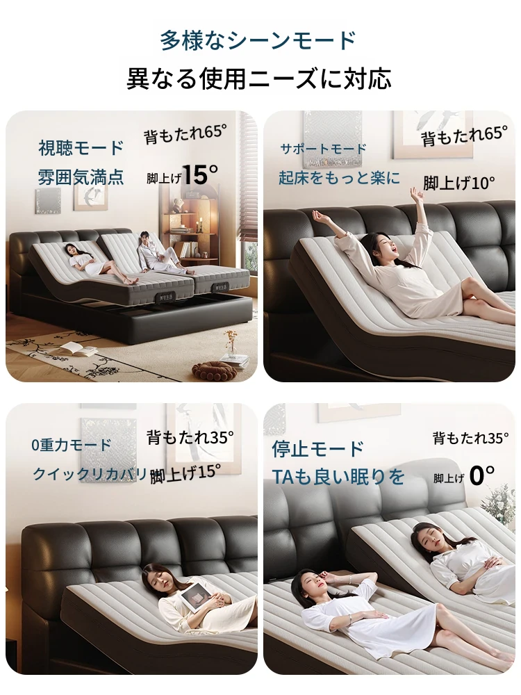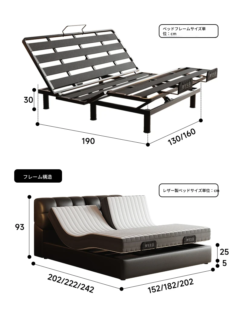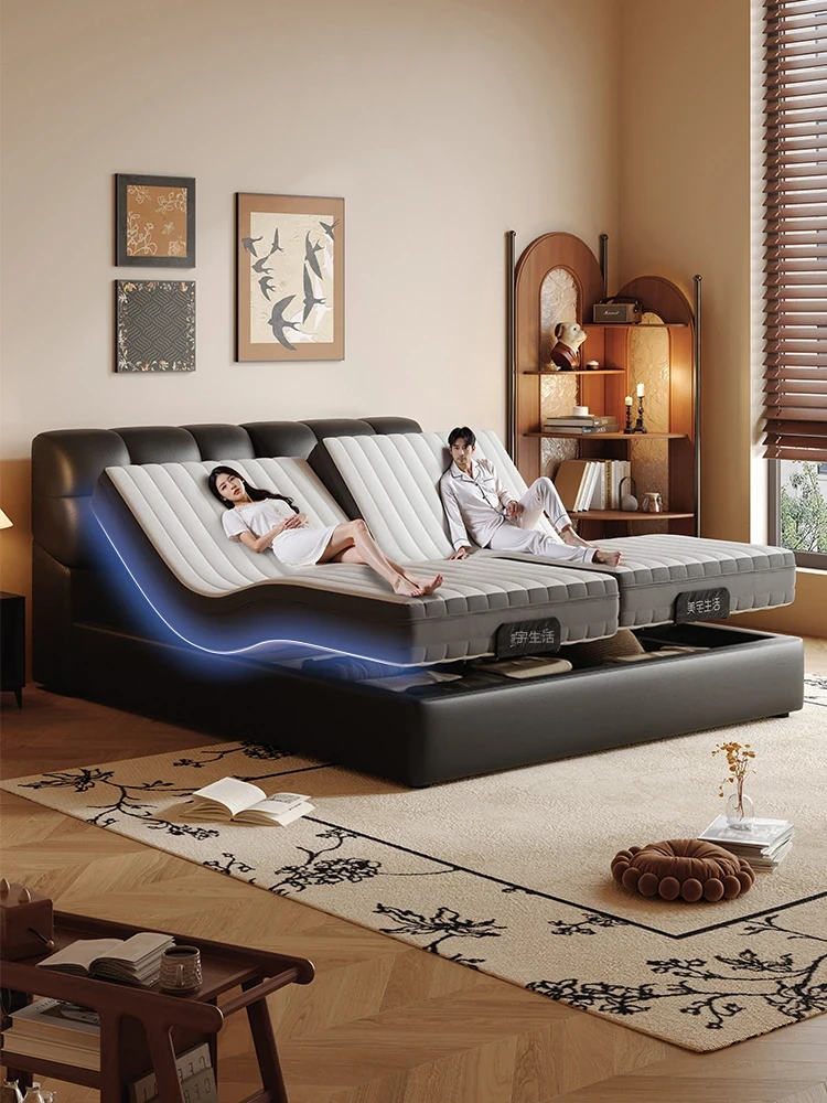 V+級輸入2.0加厚トップレザー光沢牛皮【ドイツOKINスリーモーター】ハーフ分体ベッドフレーム+八つ星マッサージ助眠マットレス