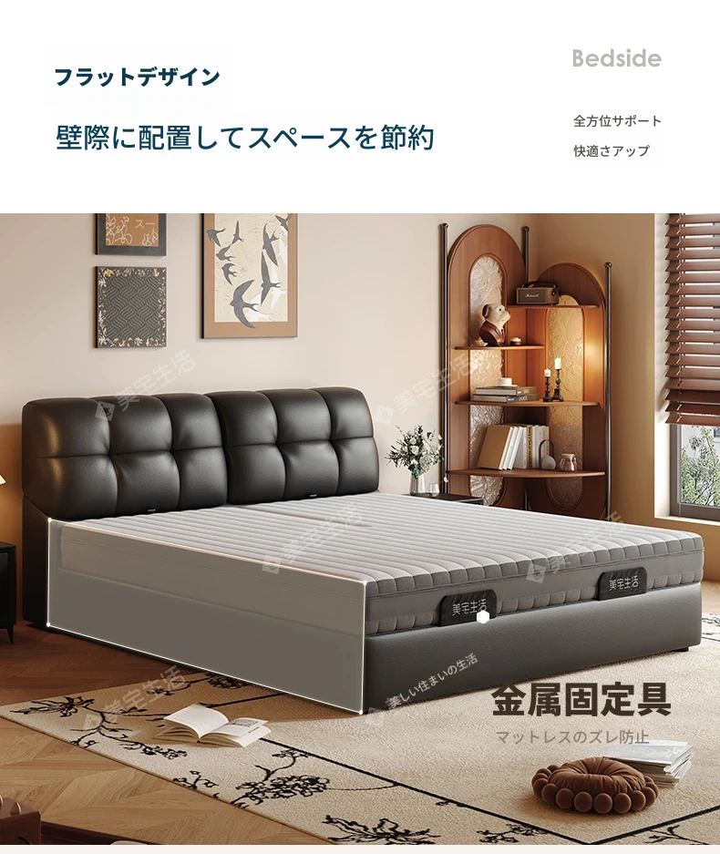 V+級輸入2.0加厚トップレザー光沢牛皮【ドイツOKINダブルモーター】ベッドフレーム+八つ星マッサージ助眠マットレス