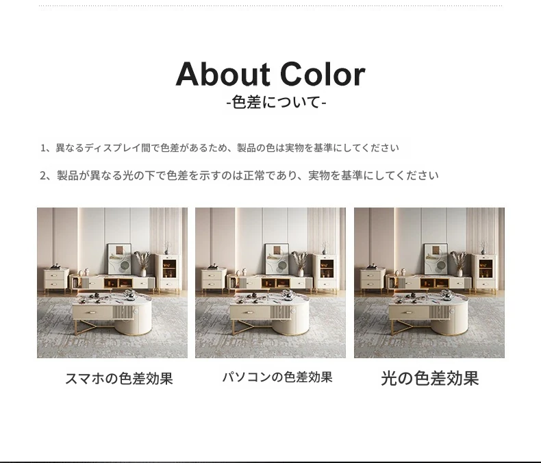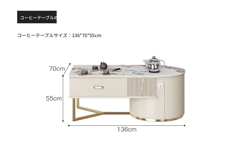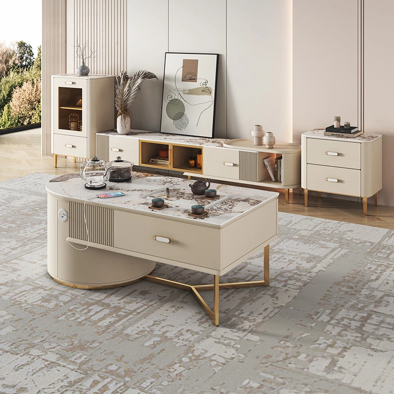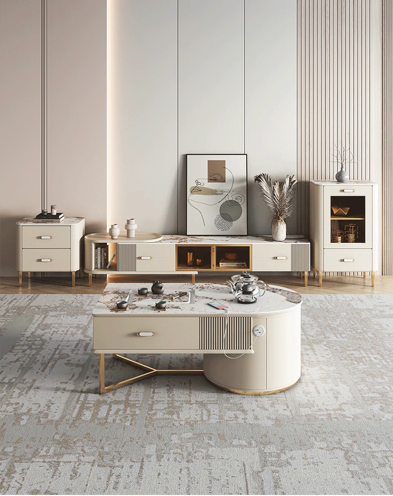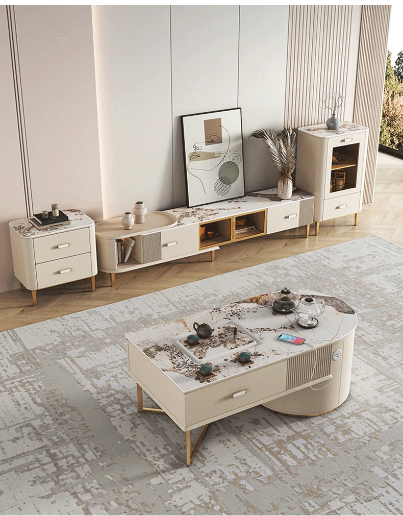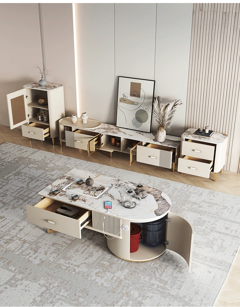 【魅力北欧风】环保仕上げのリビングルームセット - 収納付きコーヒーテーブル、TVボード、引き出しキャビネット!小スペースにもぴったりの岩板デザインで、美しい生活を演出。