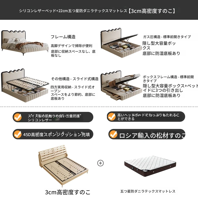 シリコンレザーベッド+22cm五つ星級抗ダニラテックスマットレス【3cm密集メタルフレーム】