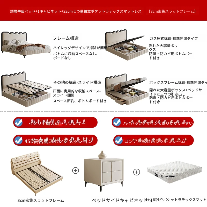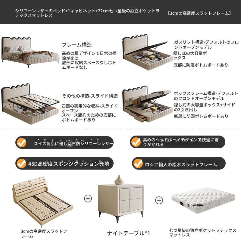 トップレザーベッド+ナイトテーブル1台+22cm七つ星級独立ポケットラテックスマットレス