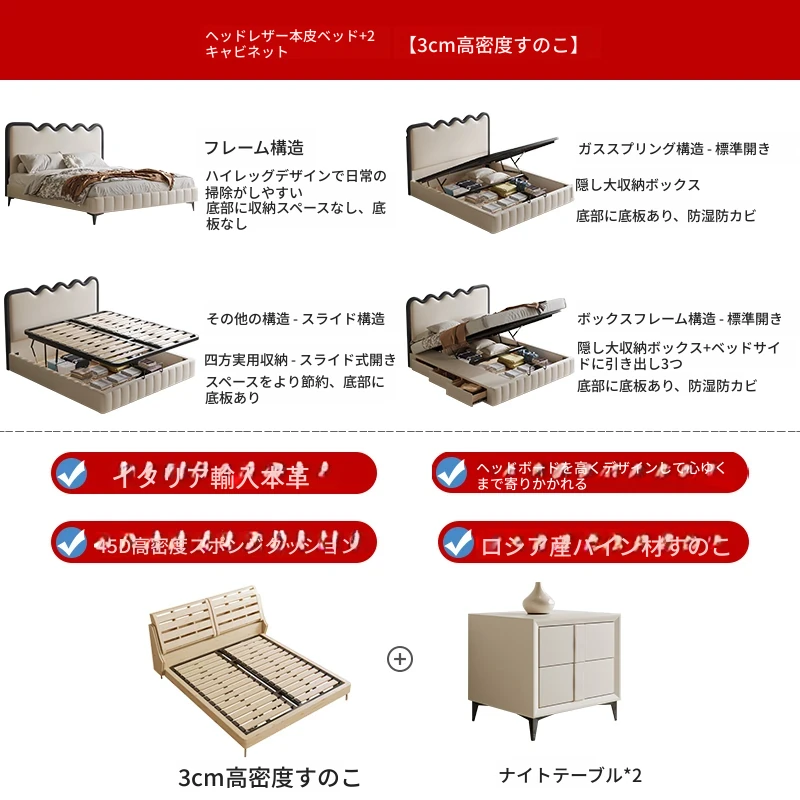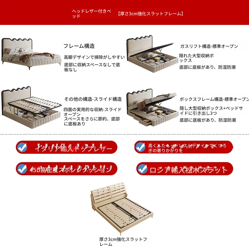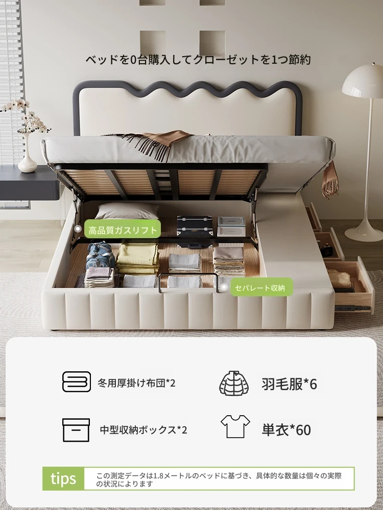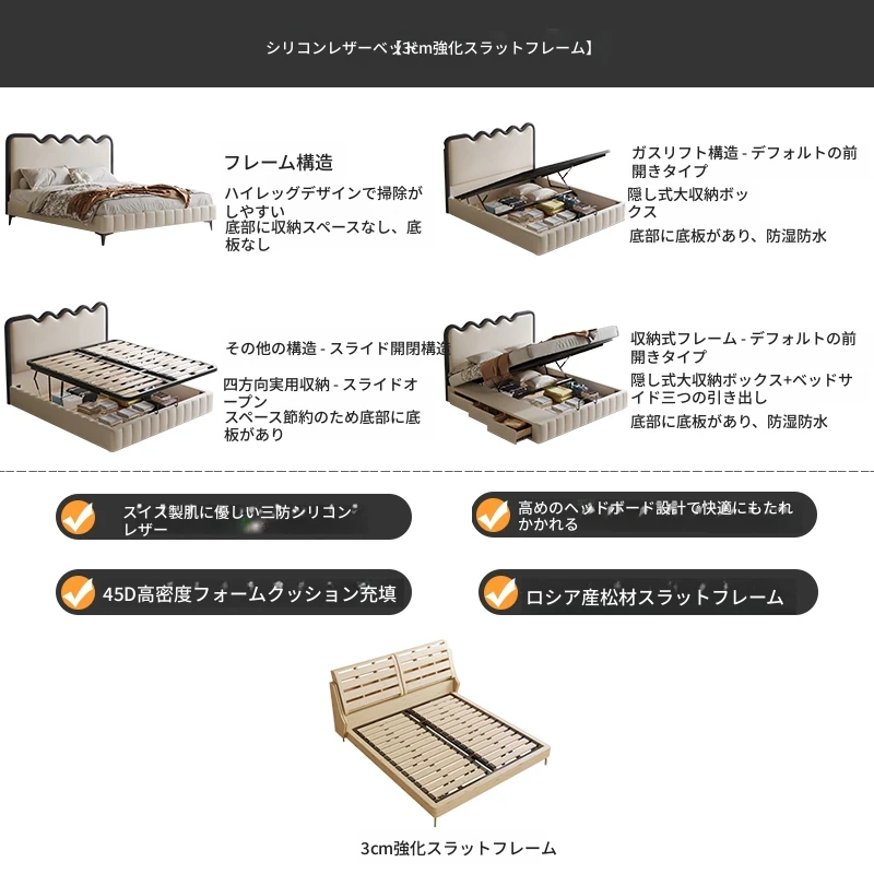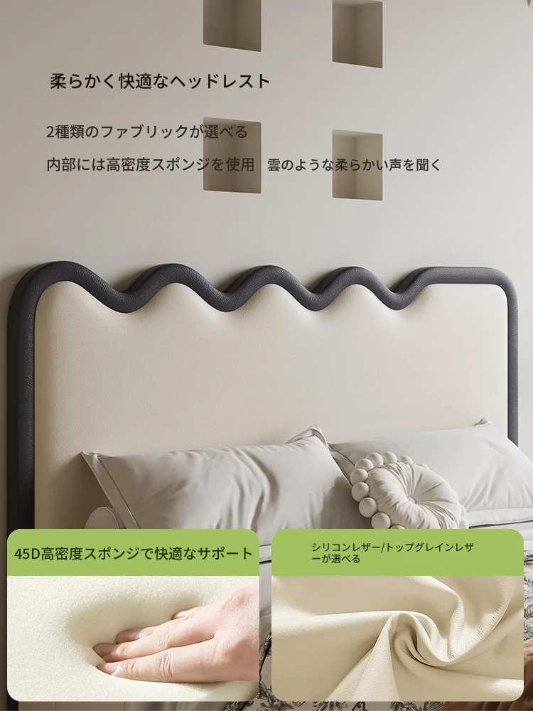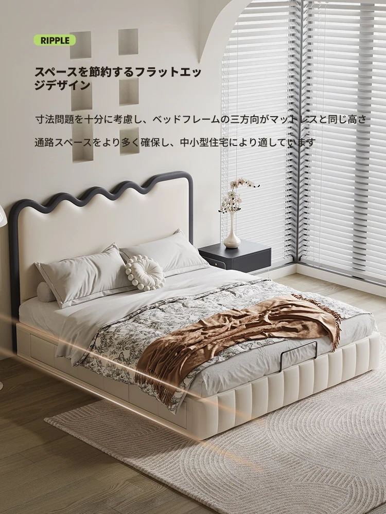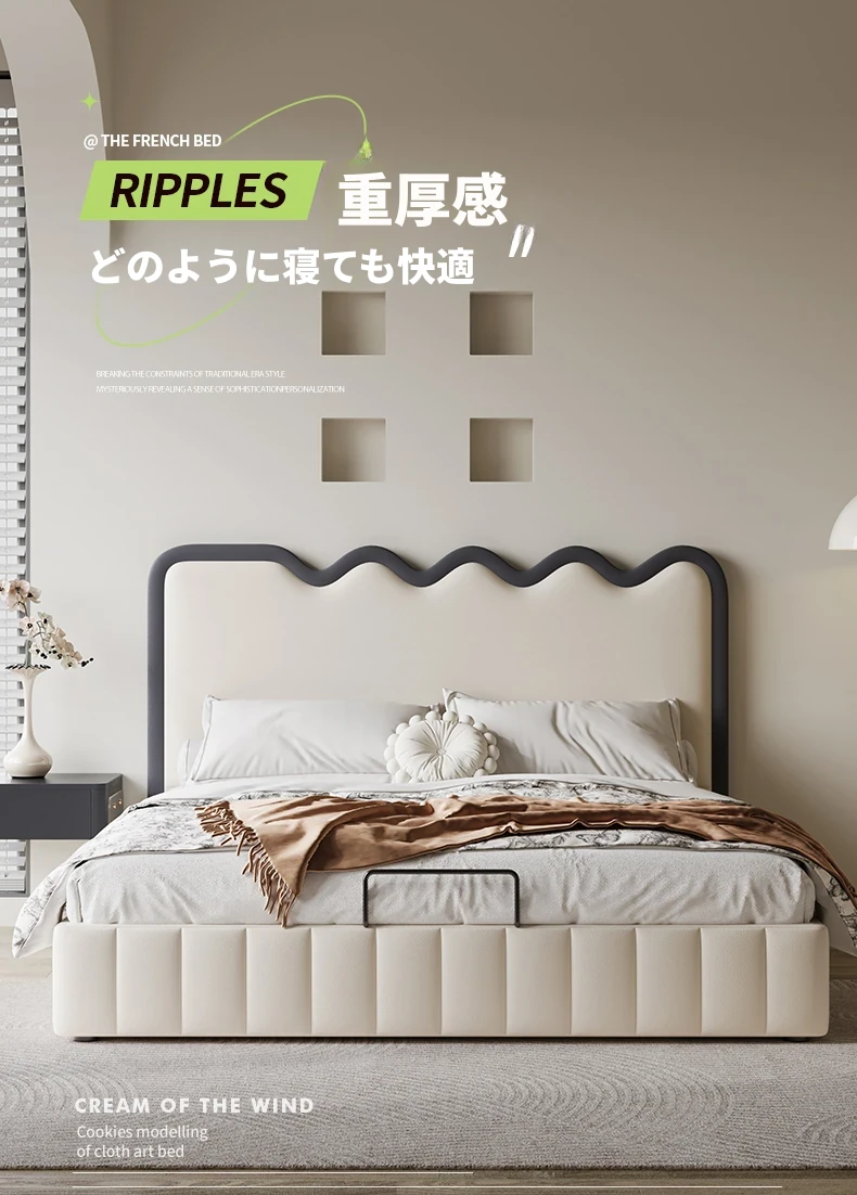 波紋デザイン!フレンチクリーム風 1.8m 主寝室収納付きモダンラグジュアリー結婚式用レザーベッド