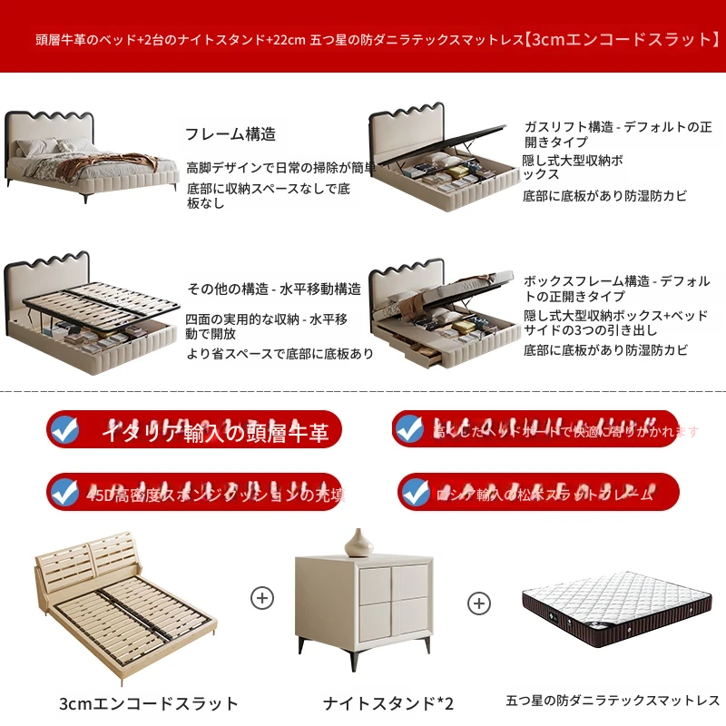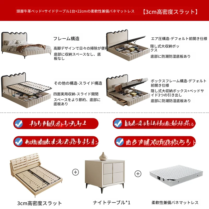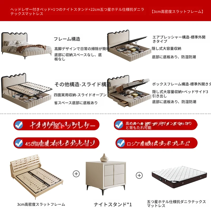 トップレザーベッド+ナイトテーブル1台+22cm五つ星級抗ダニラテックスマットレス