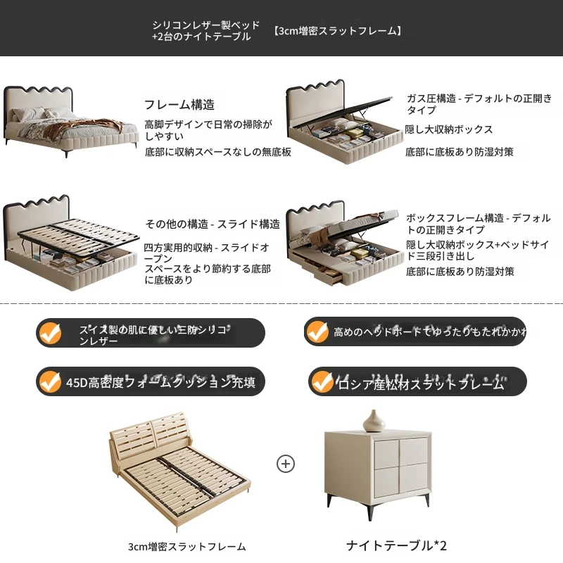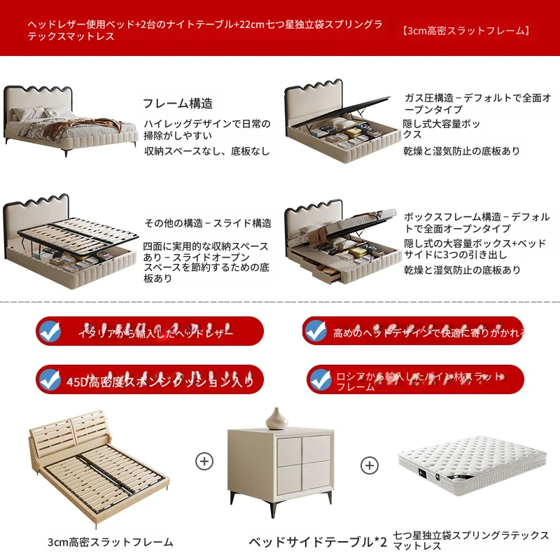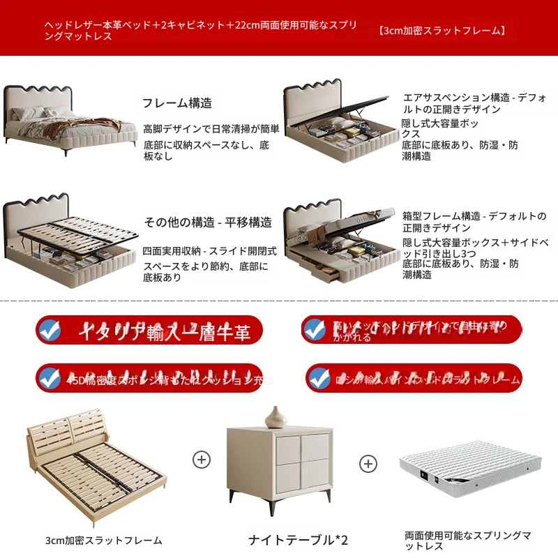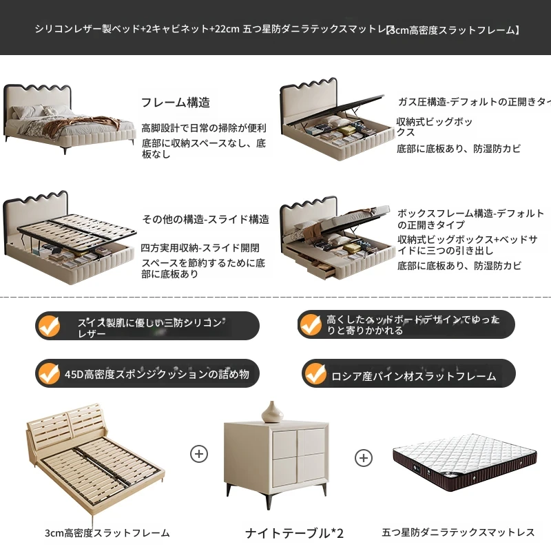 トップレザーベッド+ナイトテーブル2台+22cm五つ星級抗ダニラテックスマットレス