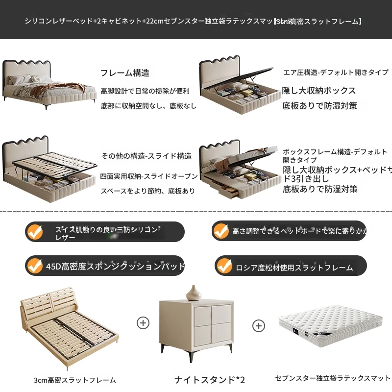 トップレザーベッド+ナイトテーブル2台+22cm七つ星級独立ポケットラテックスマットレス