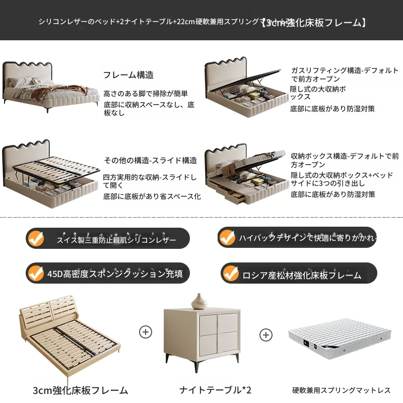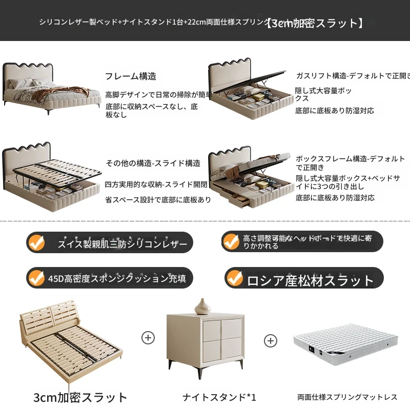 トップレザーベッド+ナイトテーブル1台+22cm硬さ調節可能スプリングマットレス