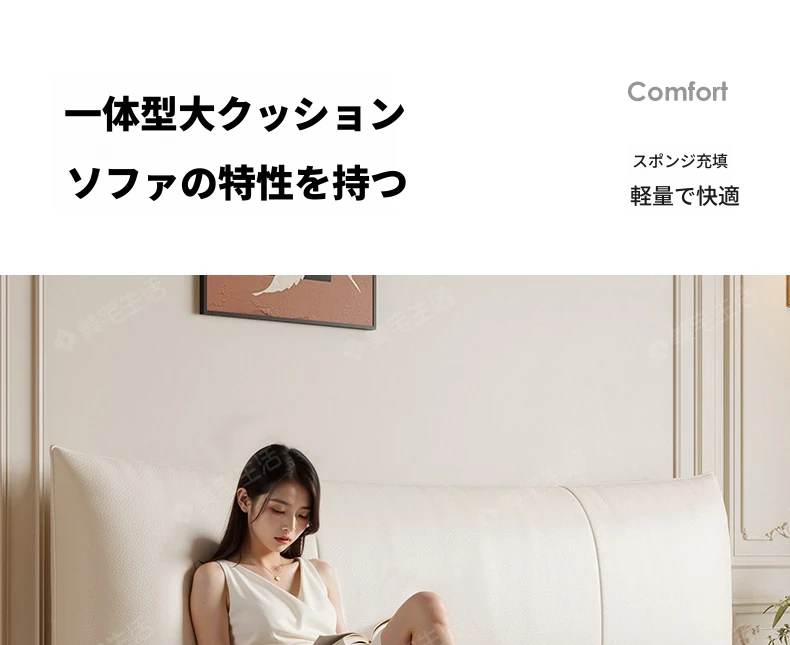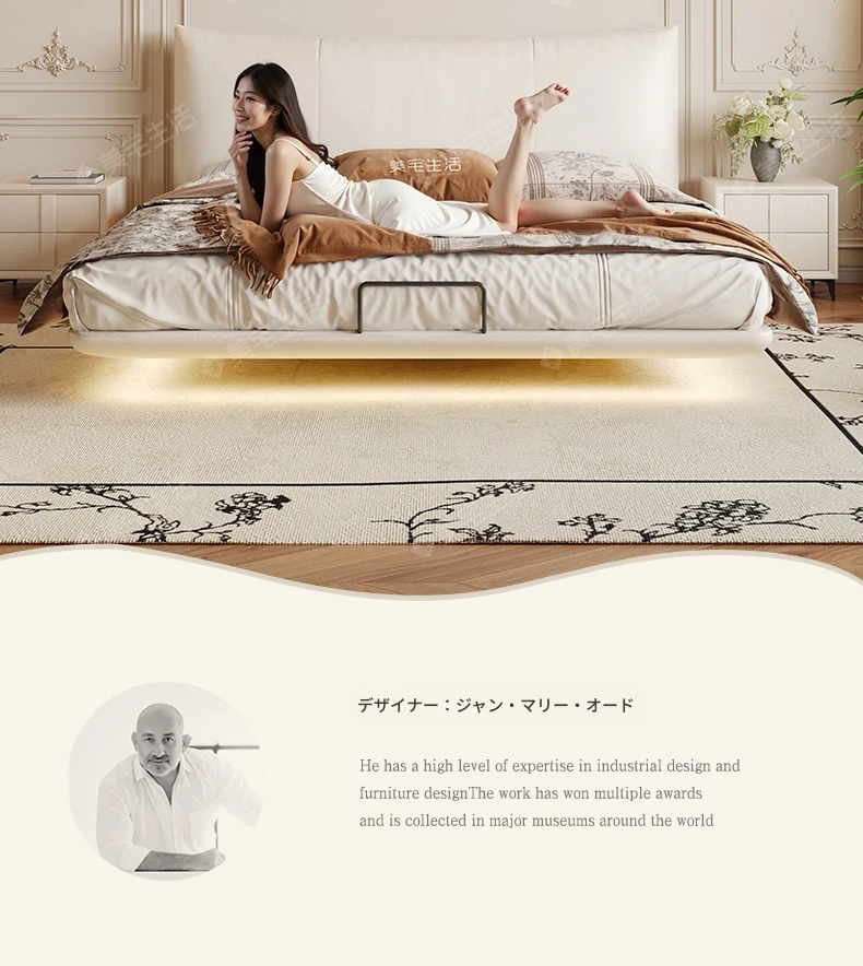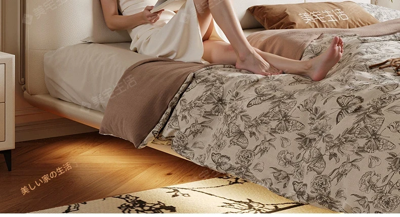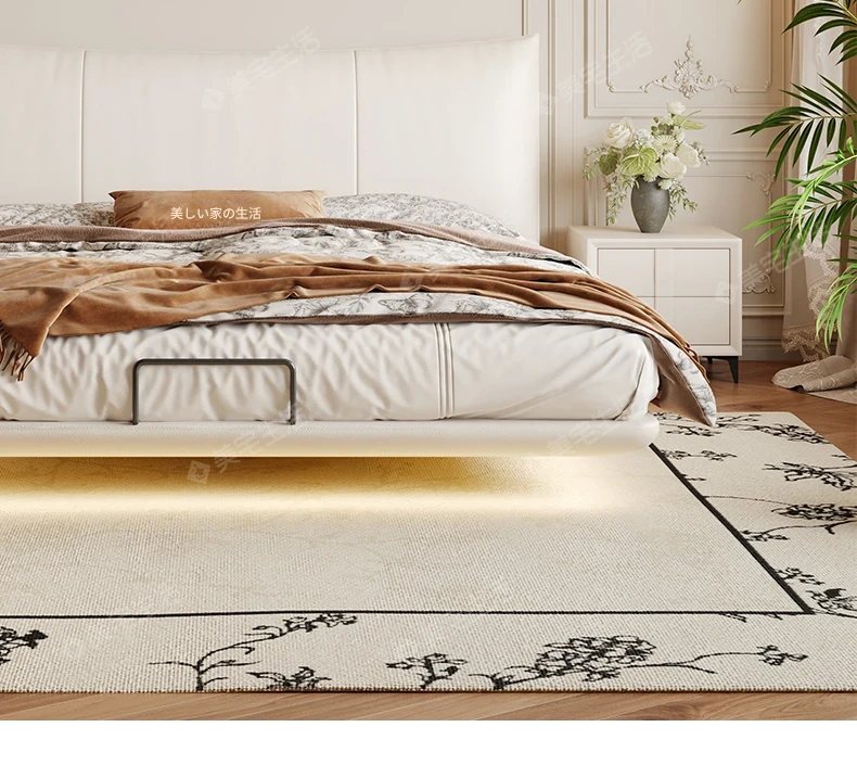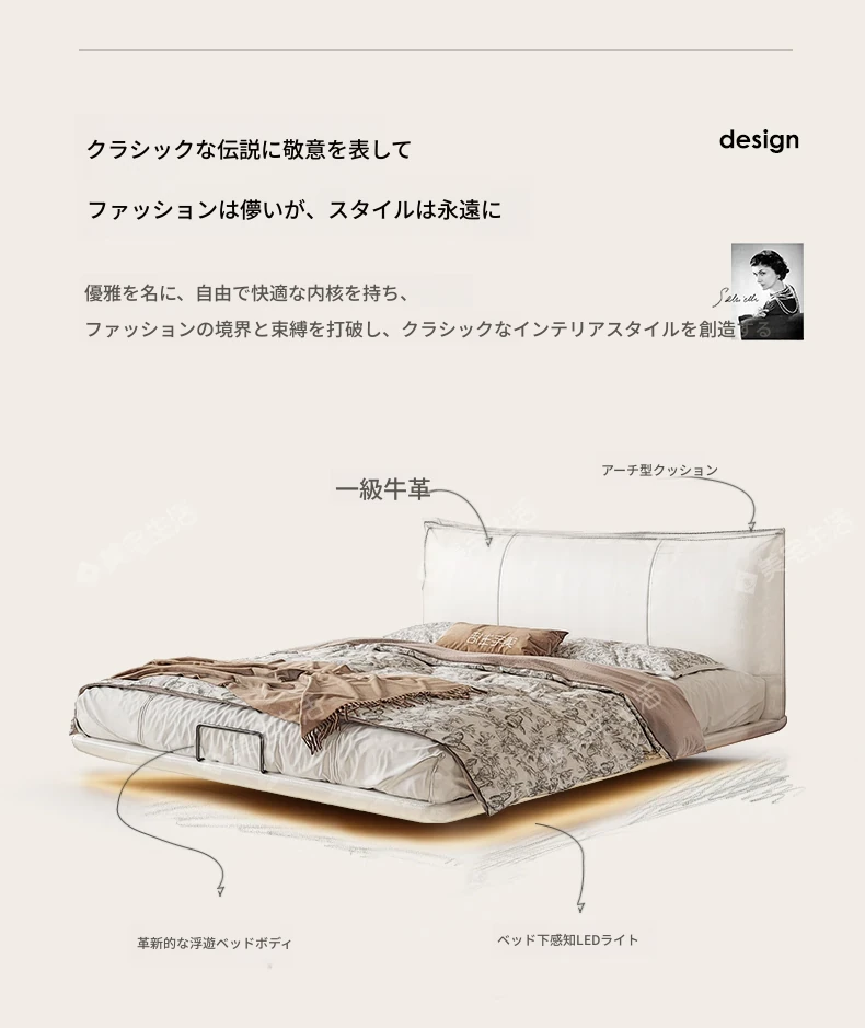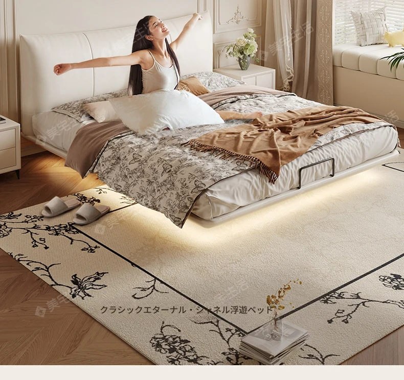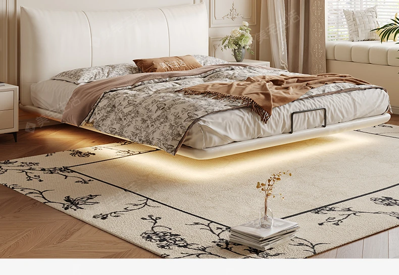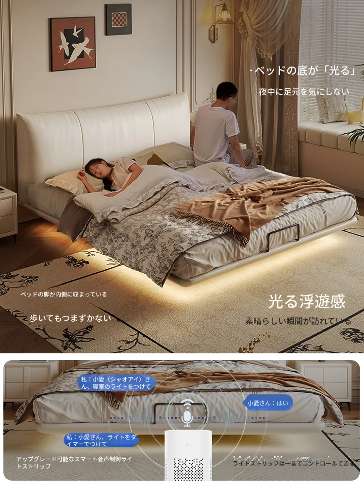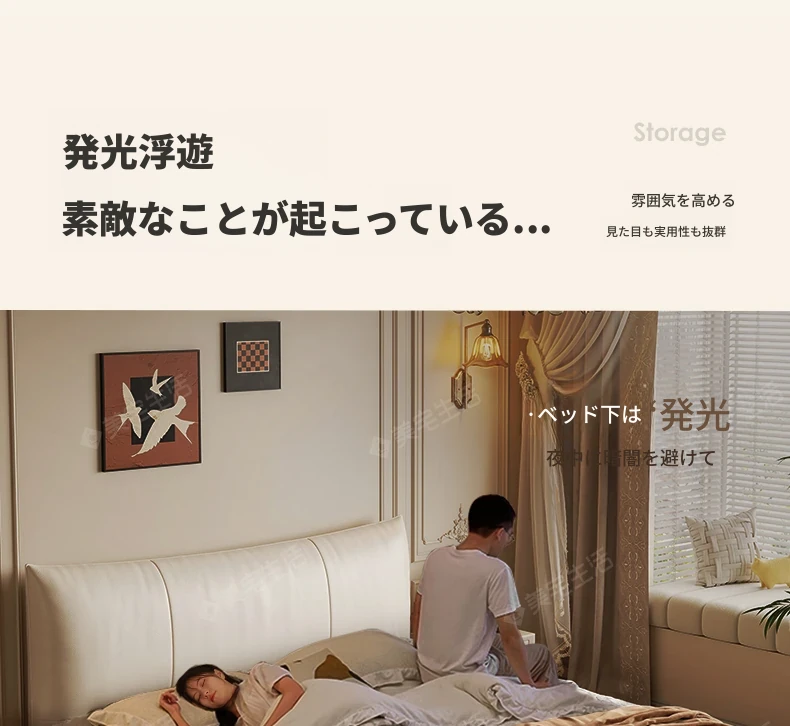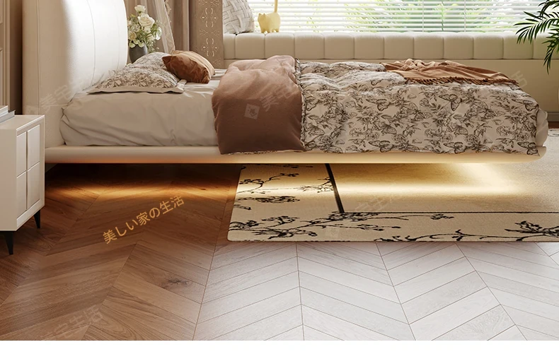 贅沢なイタリアンデザインの本革製スリーピングベッド、シンプルで洗練された無垢材の高級感あふれる黒色ソフトパッケージ、主寝室にぴったりの上品な一品。