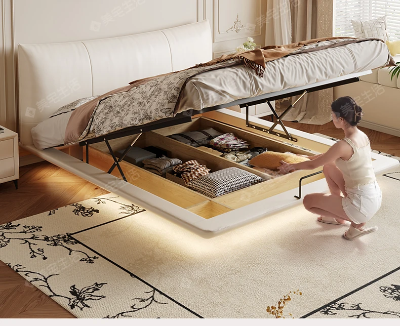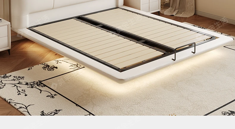 【フラッグシップ版】本革ベッド【1.2cm高密度スラットフレーム】+1キャビネット+22cm七つ星独立消音スプリングラテックスマットレス