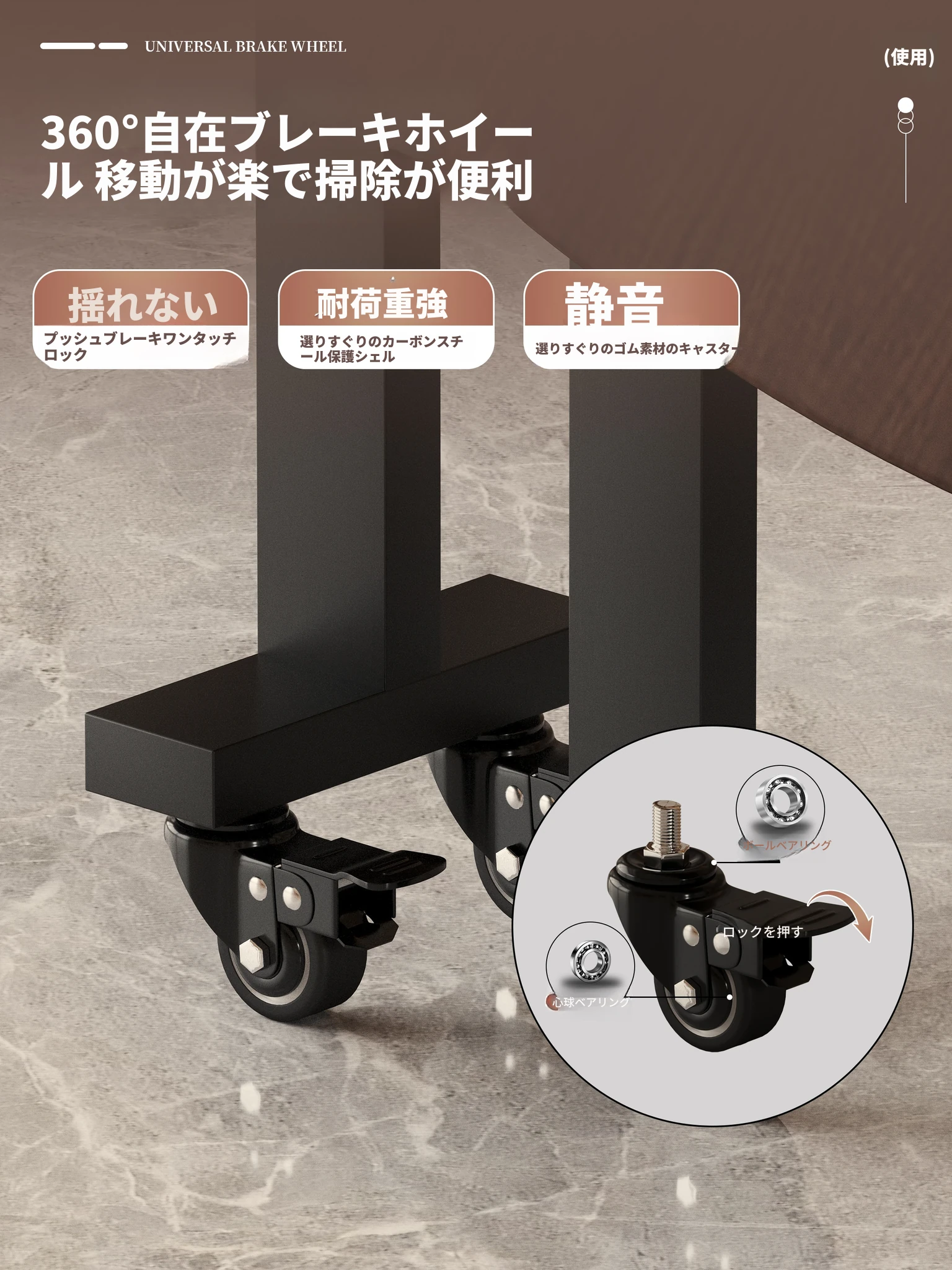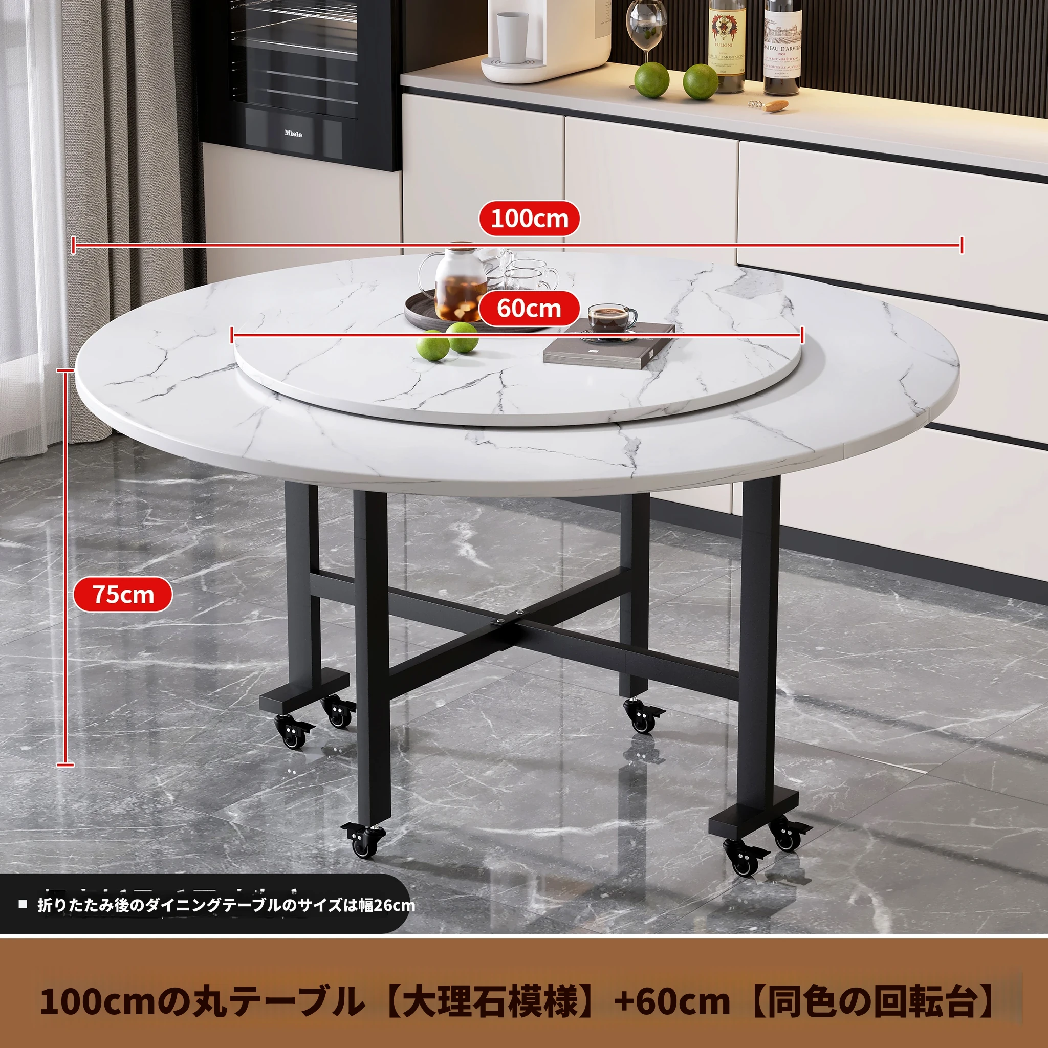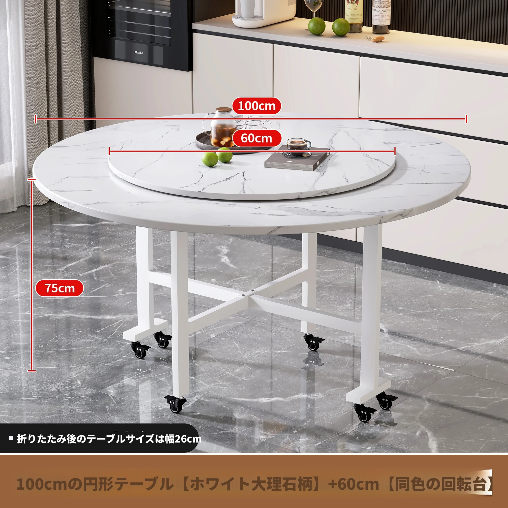 1.0メートル白大理石白脚★キャスター付き+同色0.6ターンテーブル