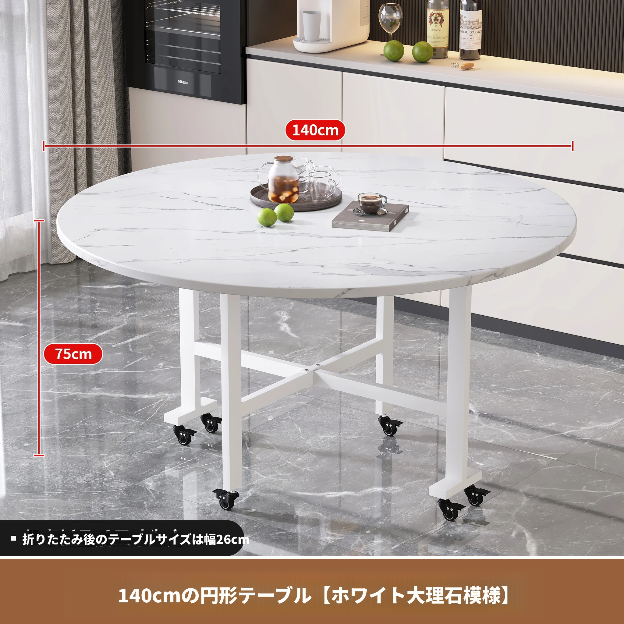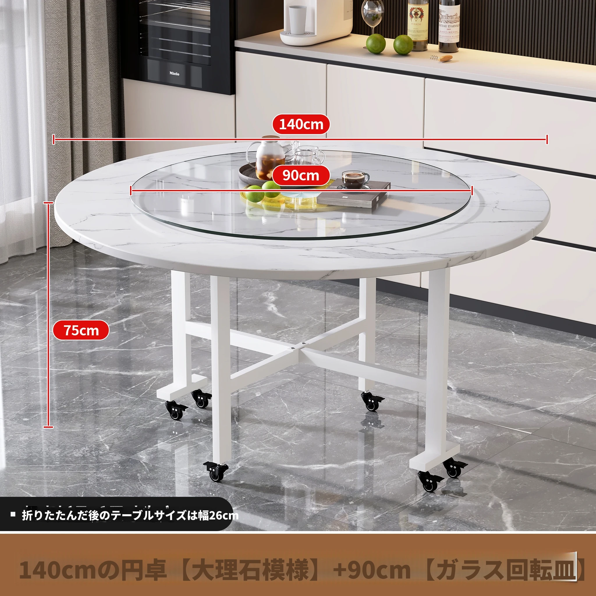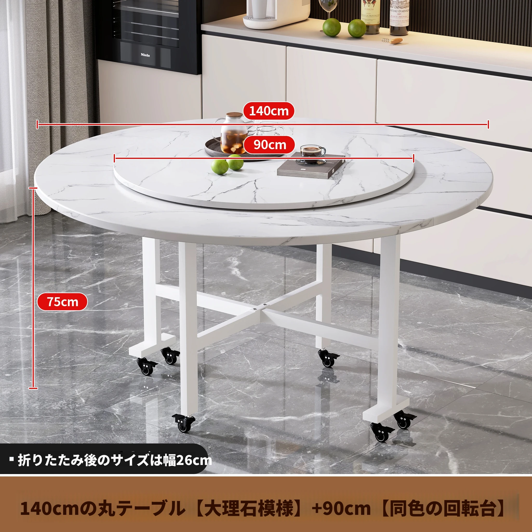 1.4メートル白大理石白脚★キャスター付き+同色0.9ターンテーブル